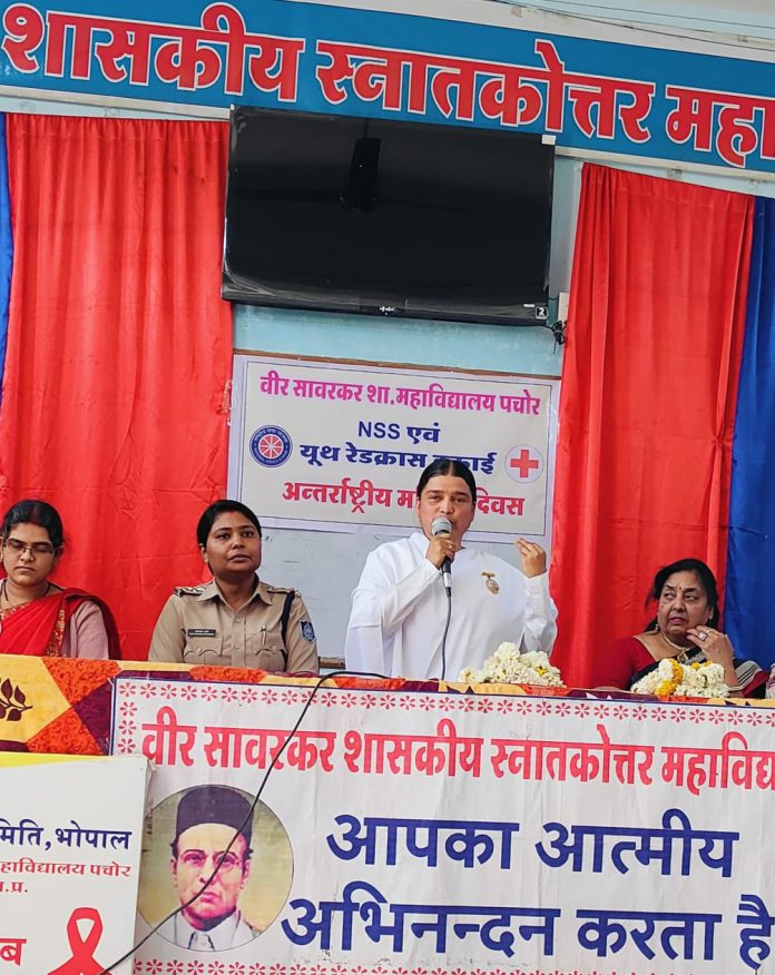 पचोर,मध्य प्रदेश। अंतर्राष्ट्रीय महिला दिवस पर वीर सावरकर महाविद्यालय में कार्यक्रम रखा गया। इस अवसर पर अतिथि – आकांक्षा शर्मा थाना प्रभारी, सुषमा गोयल लायंस क्लब उड़ान अध्यक्ष उपस्थित रहे। बीके वैशाली बहन ईश्वरीय अंतर्राष्ट्रीय महिला दिवस संदेश देते हुए।