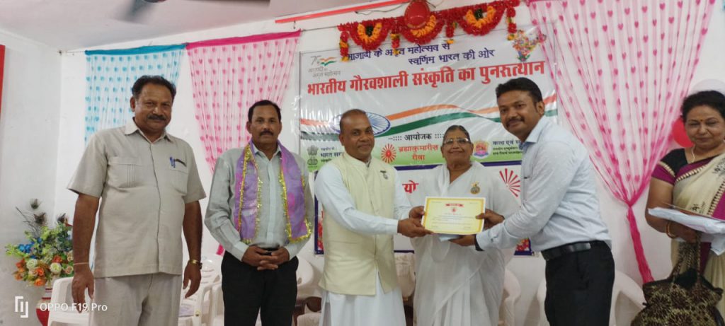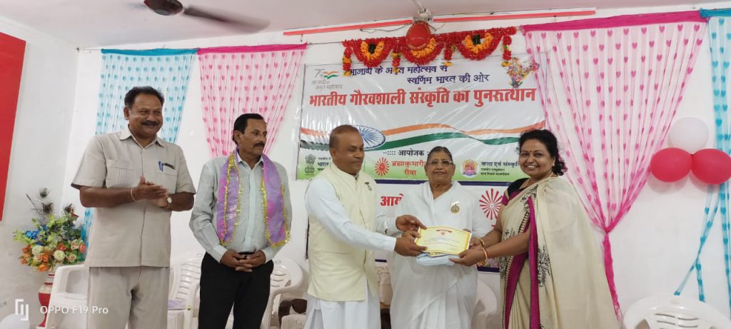 कार्यक्रम में मुख्य अतिथि तट राजकुमार शर्मा राज ने कहा कि मानवीय मूल्यों की आध्यात्मिक जीवन का बहुत महत्व है ,सभी कलाप्रेमी अपने अस्तित्व को पहचान कर ,सात्विक ,सदाचारी सृजनशील रचना का सृजन करें ,तो आदर्श समाज, स्वर्ण युग जैसा बन जाएगा। डॉ आरती तिवारी ने अपनी चिर परिचित अंदाज में बेटियों के सम्मान में काव्य रचना का पाठ किया और कहा कि संपूर्ण समाज की आधारशिला है बेटियां कहीं कमजोर नहीं है हमारी बेटियां समाज की देश की भविष्य हैं। डॉ विनोद तिवारी और डॉ दिव्या धवनने समाज में कलाओं के पूर्ण उत्थान में अपने योगदान पर चर्चा की और कहा कि मूल्यों के निर्माण में कला का एक बहुत बड़ा योगदान कलाकारों का है इसी समाज श्रेष्ठा शायरी और महान बनेगा । रीवा इंटरनेशनल स्कूल की संचालिका डॉ श्रीमती प्रवीण पटेल ने कहा कि यह ईश्वरीय विश्व विद्यालय मानव में देवत्व लाता है । यहां की शिक्षाएं मानव को देवी देवता देवी देवता जैसा बनाती हैं। इस कार्यक्रम की अध्यक्षता करते हुए राजयोगिनी में बीके निर्मला बहन ने कहा यह संसार प्रारंभ में स्वर्णिम काल था और सही कलाकार मिलकर इस संसार को फिर से स्वर्ग अवश्य बनाएंगे मुझे पूर्ण विश्वास है वा मेरी शुभकामनाएं हैं। बी के बिंदु बहन ने ब्रह्माकुमारी संस्थान का परिचय दिया एवं बीके निलेश श्रीवास्तव ने परमात्म स्मृति का गीत प्रस्तुत किया । राजयोग मेडिटेशन बीके अर्चना बहन वा बीकेनम्रता ने कराया। कला एवम संस्कृति के राष्ट्रीय आयोजन में विंध्य क्षेत्र के प्रमुख सभी विधा के कलाकारों को सम्मानित किया गया। जिसमें नीलेश श्रीवास्तव, रागिनी सिंह ,राजमणि तिवारी भोला ,रत्नेश गोस्वामी राजबीर तिवारी , रीति पाण्डे, शिव सिंह कुशवाह ,रामकृष्ण द्विवेदी ,ज्ञानेंद्र सिंह, सत्येंद्र त्रिपाठी, मार्तंडमणि पांडे ,प्रांजली वर्मा ,गुंजन शुक्ला, सुनील भारती, रोहित सेन ,प्रभाकर विश्वकर्मा ,साहिल दहिया ,मोहित सेन ,अंकुश पटेल, डॉ प्रवीर दुबे ,संजीव श्रीवास्तव ,राज किशोर शर्मा, शैलेंद्र त्रिपाठी , कुश श्रीवास्तव, दीपिका पटेल, दीक्षा गोस्वामी, आलोक दिक्षित ,बादल नट ,अनीता उपाध्याय , विपुल सिंह ,विनोद मिश्रा ,रामचंद्र वर्मा ,विजयलक्ष्मी मिश्रा ,राहुल मिश्रा सहित विंध्य के प्रमुख कलाकारों को सम्मानित किया गया। सभी कलाकारों का आभार प्रदर्शन नीलेश श्रीवास्तव ने किया।