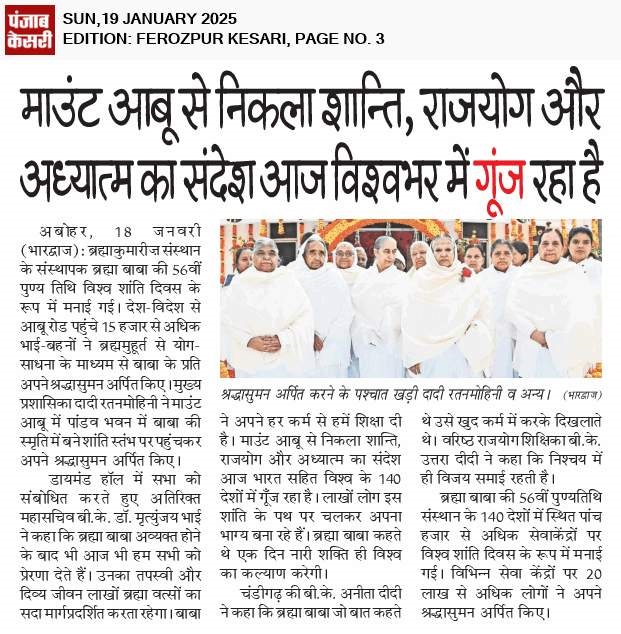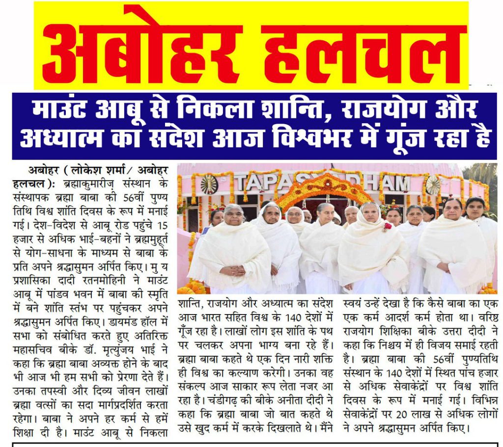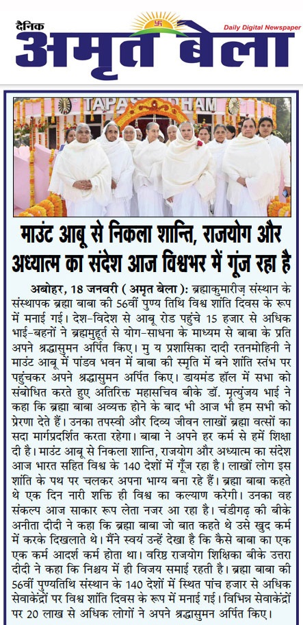 माउंट आबू, राजस्थान: ब्रह्माकुमारी संगठन के संस्थापक प्रजापिता ब्रह्मा बाबा की 56वीं पुण्यतिथि पर संगठन के अंतर्राष्ट्रीय मुख्यालय पांडव भवन परिसर स्थित बाबा के समाधि स्थल पर शनिवार को देश-विदेश से आए हजारों राजयोगी श्रद्धालूओं ने श्रद्धासुमन अर्पित कर विश्व शांति व मानवीय एकता के लिए विशेष साधना की।