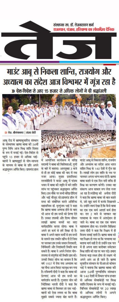 विश्वशान्ति, मानवीय एकता, देश की सुख समृद्धि के लिए देश-विदेश से आए राजयोगी श्रद्धालूओं ने अलसुबह से ही प्रजापिता ब्रह्मा बाबा के समाधि स्थल शान्ति स्तम्भ पर सामुहिक रूप से राजयोग का अभ्यास करते हुए शान्ति के शक्तिशाली प्रकम्पन्न प्रवाहित किए। दिन भर ब्रह्मा बाबा की तपस्यास्थली कुटिया, समाधिस्थल शांतिस्तंभ, मेडिटेशन हाल में राजयोग, ध्यान के कार्यक्रम हुए।–