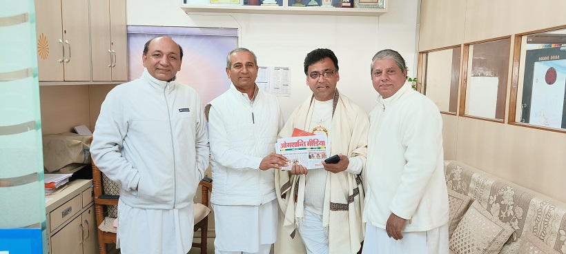 आबूर रोड, राजस्थान। भीमताल में बने छ: एकर के रिसोर्ट ,कैनेडा में बने अनेक अपार्टमेंट्स के मालिक बी. के. आदित्य भाई को ईश्वरीय सौगात भेंट करते हुए ओम शांति मीडिया के संपादक राजयोगी बी. के. गंगाधर भाई, साथ में हैं जाने माने माउंट आबू के कवी राजयोगी बी. के. विवेक भाई, बी. के. गोविन्द भाई।