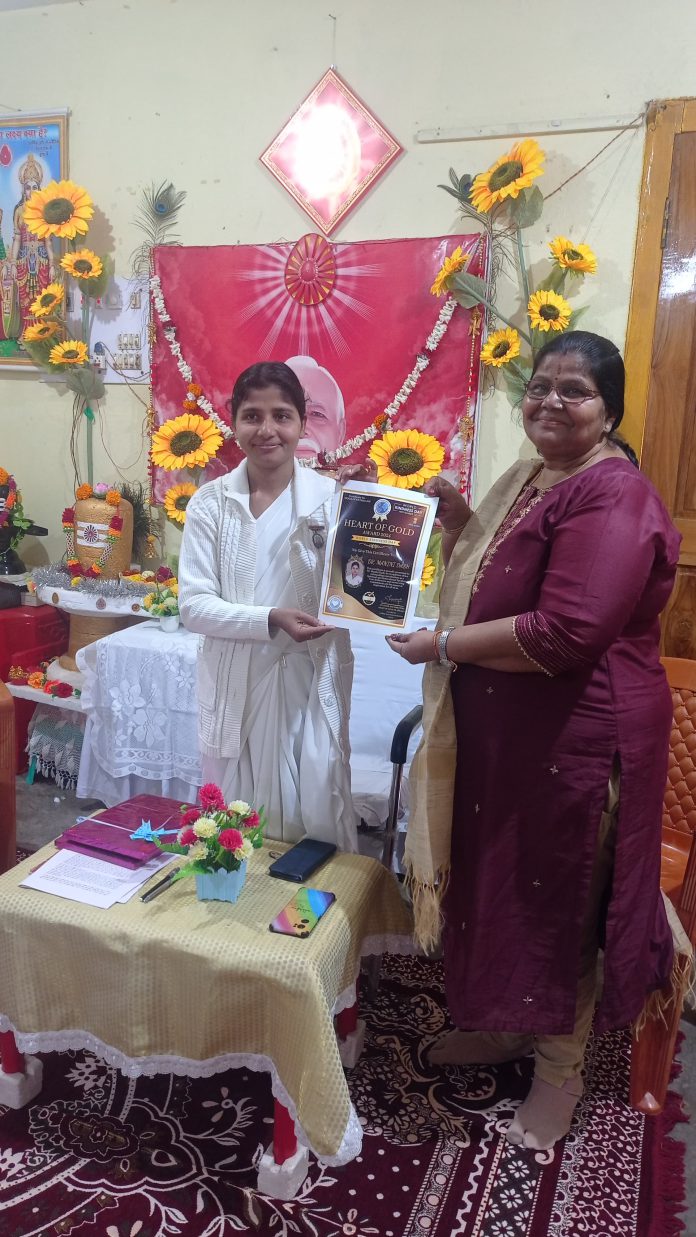 चक्रधरपुर (झारखंड) । ब्रह्मा बाबा के अव्यक्त दिवस के अवसर पर आयोजित श्रद्धांजलि सभा पर ब्रह्मकुमारीज पाठशाला की संचालिका बी.के. मानिनि बहन को हार्ट ऑफ गोल्ड अवार्ड से सम्मानित करती उद्यमी पत्नी उर्मिला सिंघानिया ।