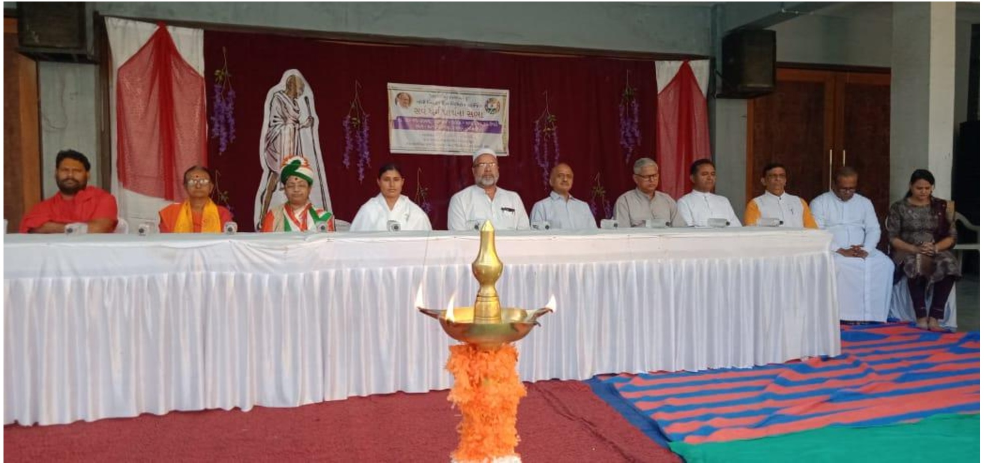 अहमदाबाद-इंडिया कॉलोनी , गुजरात। राष्ट्रपिता महात्मा गाँधी जी के निर्वाण दिवस के निमित्त होली फेमिली पेरिस ट्रस्ट संचालित तीन क्रिश्चन विद्यालय में सर्व धर्म सम्मलेन आयोजित किया गया | जिसमें सर्वधर्म के संतो को प्रार्थना सभा मेंआमंत्रित किया गया। इंडिया कॉलोनी सेवाकेंद्र से ब्रह्माकुमारी मालती बहन और सर्वधर्म के संतो ने दीप प्रज्वलित किया।