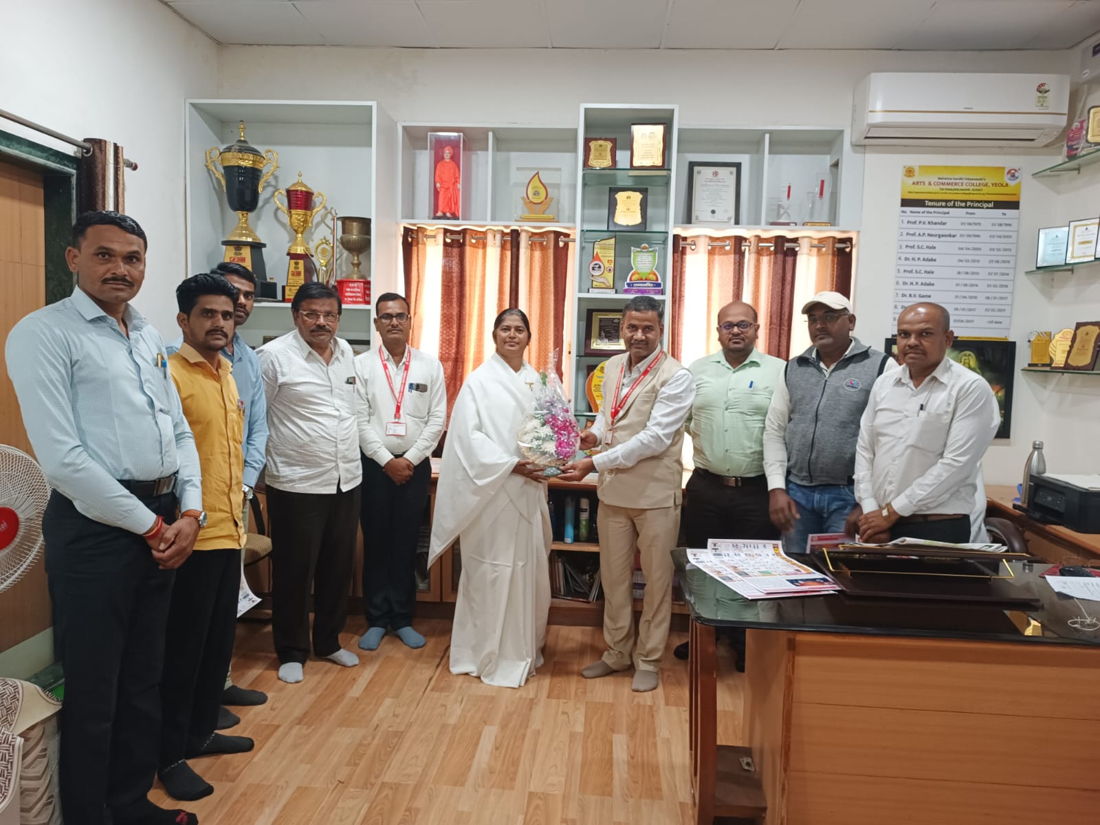 येवला-महात्मा गांधी,महाराष्ट्र। विद्यामंदिर सीनियर कॉलेज के प्राध्यापक के लिए राजयोग मेडिटेशन सिखाने के पश्चात सेवाकेंद्र संचालिका ब्र.कु.नीता दीदी का सत्कार करते हुए कॉलेज प्रिन्सिपल डॉ. भाऊसाहेब गमे तथा अन्य प्राध्यापक गण।
