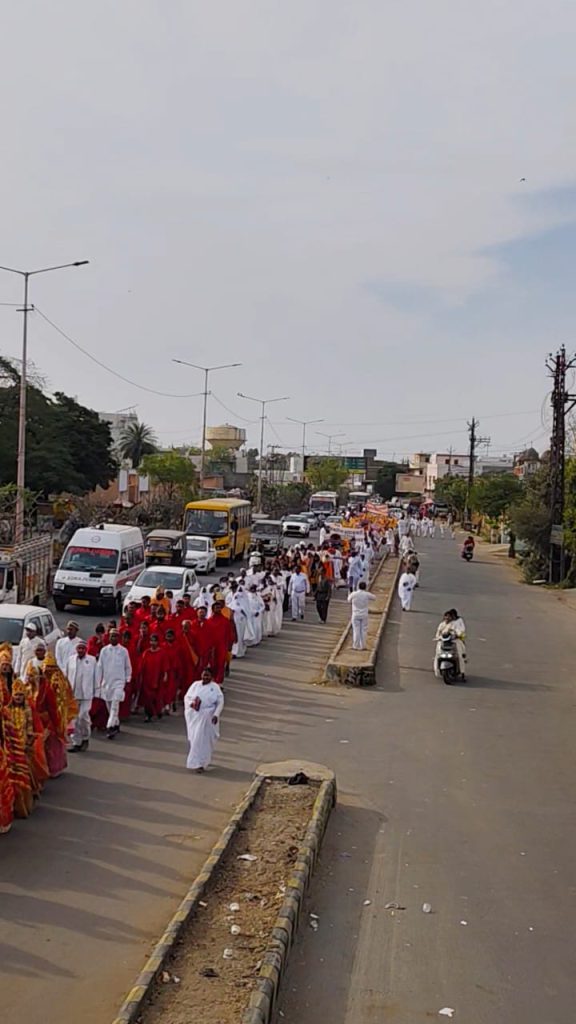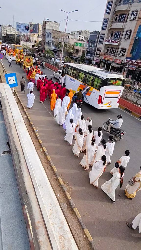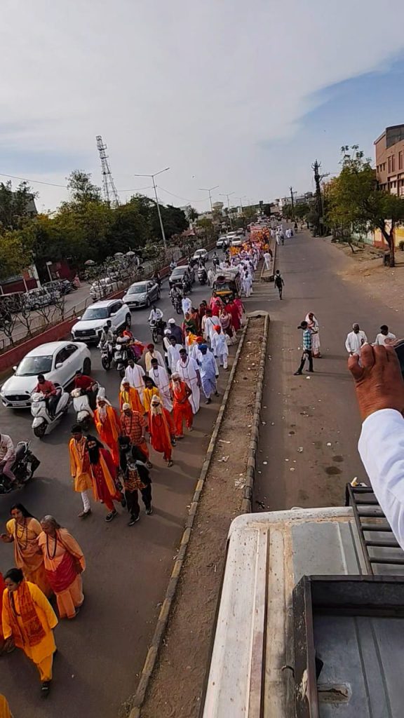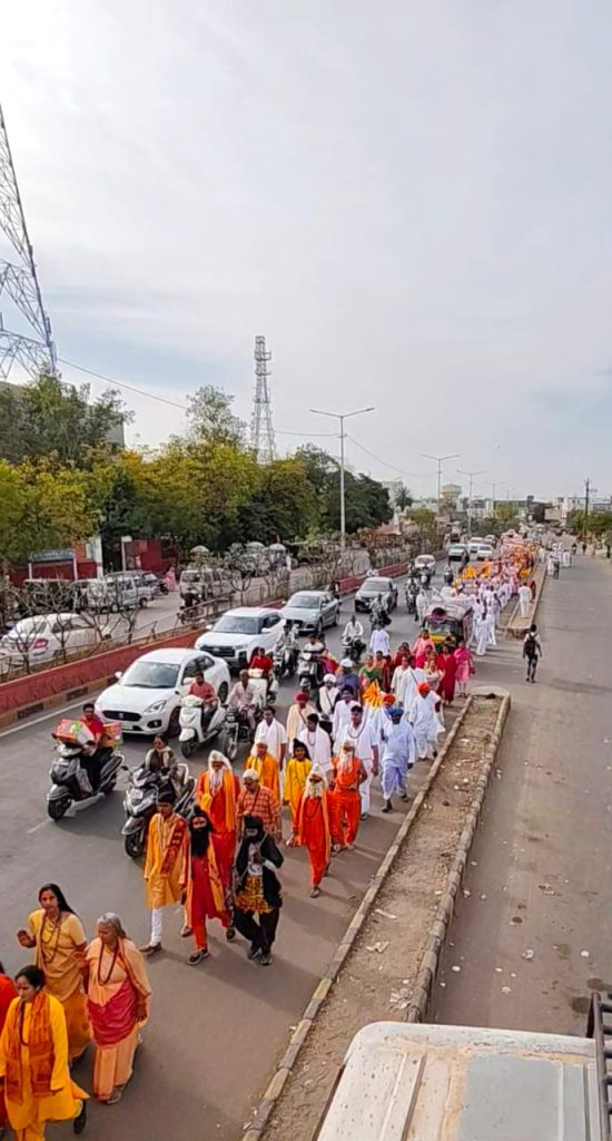 भीलवाड़ा राजस्थान। विश्व एक परिवार शोभायात्रा में सनातन धर्म, जैन धर्म, बौद्ध धर्म, सिख धर्म, मुस्लिम धर्म, एवं ईसाई धर्म के अनुयायियों को दर्शाया गया | साथ भारत माता, सुसज्जित रथ में श्री लक्ष्मी श्री नारायण की झांकी, श्री सीताराम की झांकी, घोड़ों पर शिव ध्वज लिए शिव शक्तियां, शिव जी की झांकी, शिवजी की बारात एवं देवी और देवताओं को भी दिखाया गया। झांकी में सन्देश दिया गया कि एक परमात्मा शिव रचयिता है और सभी धर्म उस बीज से निकले टहनिया एवं पत्ते हैं। यह शोभायात्रा प्रजापिता ब्रह्माकुमारी ईश्वरीय विश्वविद्यालय द्वारा शिवरात्रि के उपलक्ष में निकाली गई जो की संगीत कला केंद्र से आरंभ हुई और राम द्वारा रोड गोल प्यायु रेलवे स्टेशन हरी सेवा धर्मशाला होते हुए संगीत कला केंद्र में समाप्त हुई । रामद्वारा मार्ग में शोभायात्रा का पुष्पों के द्वारा स्वागत किया गया। इसके अंतर्गत भीलवाड़ा के अतिरिक्त गुलाबपुरा, शाहपुरा, बिजोलिया, असिन्द, काछोला के ब्रह्मा कुमारीज के लगभग 1000 भाई बहनों ने भाग लिया। सभी श्वेत वस्त्र धारी हाथ में परमात्मा शिव का ध्वज एवं परमात्मा शिव के नीति वचन की तख्तियां लिए हुए थे।