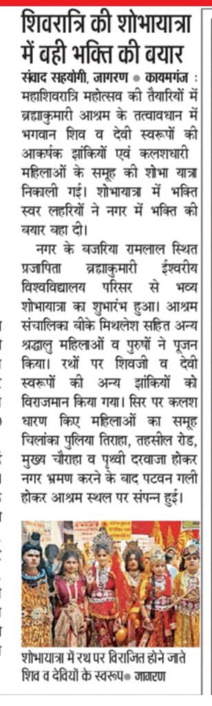 कायमगंज ,उत्तर प्रदेश। शिव जयंती के उपलक्ष में एक भव्य शोभा यात्रा का आयोजन किया गया। ब्रह्माकुमारी मिथिलेश बहन ने झंडारोहण किया आमंत्रित श्रीमती डॉक्टर मिथिलेश अग्रवाल जी पूर्व सदस्य राज महिला आयोग माननीय भरता यशवीर सिंह यादव जी जिला पंचायत सदस्य आदि मौजूद रहे।