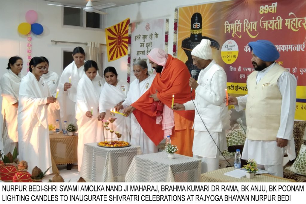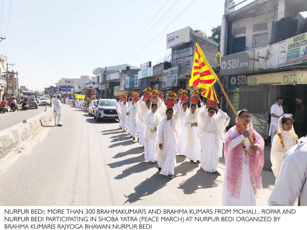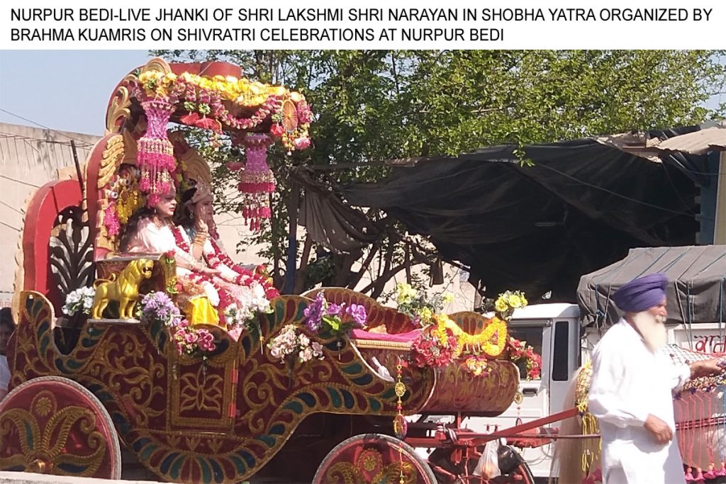 Nurpur Bedi,Punjab : A grand procession was organised with live tableaux of Lord Shiva, Shri Lakshmi Narayan etc. in which the band was in the lead, then two kumaris carrying the flag of Lord Shiva, then 21 Kalashdhari sisters, then mothers and Brahma kumar brothers were walking in a queue in the remembrances of Lord Shiva, spreading the rays of peace and love in the world. The procession started from Rajyog Bhawan, which passed through the main markets and lanes of Nurpur Bedi and concluded again at Rajyog Bhawan. The procession was welcomed at various places by many religious, social organizations and eminent personalities of the city with water, flowers and fruits. Brahma Kumari sisters presented divine gifts, prasad and literature to the welcomers.