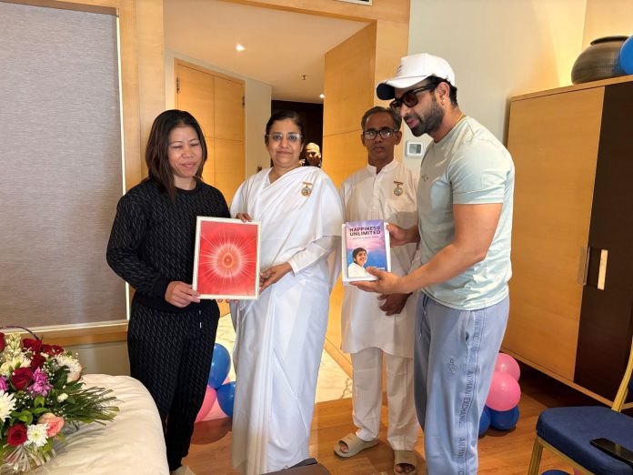बी के मनीषा बहन ने फूलों के गुलदस्ते से मेरीकोम का स्वागत किया।