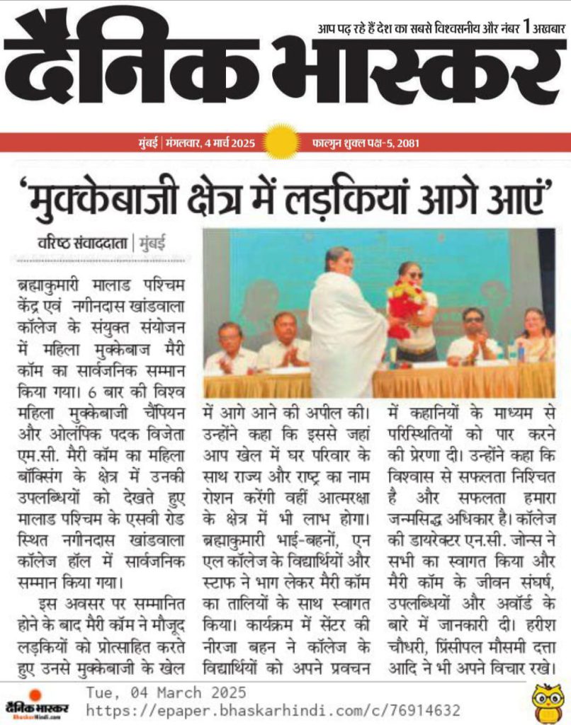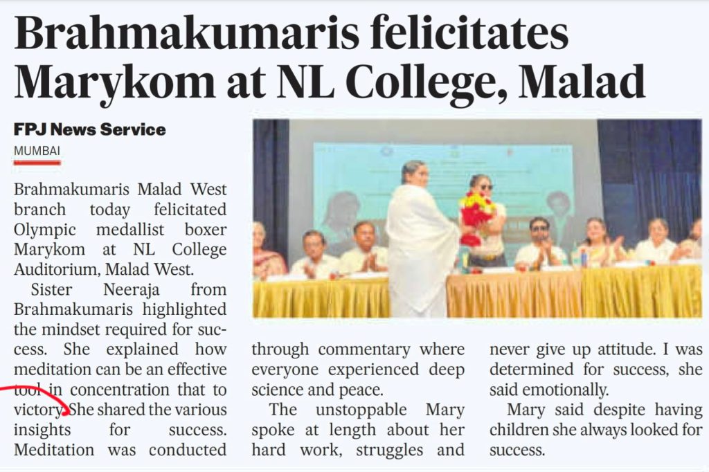 मुंबई-मालाड वेस्ट महाराष्ट्र: ब्रह्माकुमारीज मालाड वेस्ट के सौजन्य से और नागीनदास खांडवाला कालेज के सहयोग से वर्ल्ड बाक्सिंग चैम्पियन एम सी मेरीकोम का स्वागत-सत्कार का आयोजन बहुत ही सफलतापूर्वक संपन्न हुआ। ब्रह्माकुमारीज भाई-बहनों और एन एल कॉलेज के स्टूडेंट्स और स्टाफ ने बहुत उत्साह-पूर्वक भाग लिया।