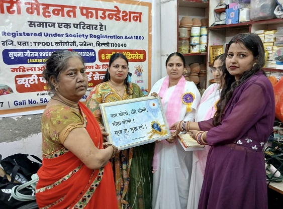 दिल्ली-नरेला : हमारी मेहनत फाउंडेशन संस्था “ द्वारा एक सिलाई सेंटर और ब्यूटीपार्लर खोला गया। मुख्य अतिथि के रूप में नरेला पाना उद्यान सेवाकेंद्र की प्रभारी ब्रह्माकुमारी गीता बहन जी को सम्मानित किया गया । जिसमें हमारी मेहनत फाउंडेशन की अध्यक्षा श्रीमती सुषमा गौतम जी ने सभी का स्वागत किया और साथ में पंजाब केसरी क्लब ( जांटी ) की अध्यक्षा श्रीमती कमलेश तुषीर जी भी उपस्थित थी जिन्होंने ब्रह्माकुमारी बहनों को सम्मानित किया। एक्शन इंडिया न्यूज़ पेपर के मुख्य पत्रकार भ्राता श्री रामा खत्री जी और अन्य व्यक्ति भी शामिल थे । रिब्बन काटकर केंद्र की ओपनिंग की गई । बहनों ने केंद्र की संचालिका को ईश्वरीय सौगात भेंट की ।