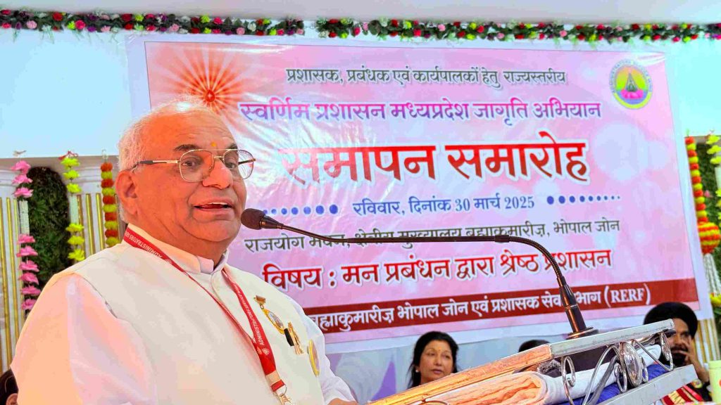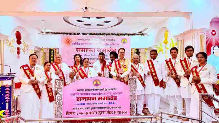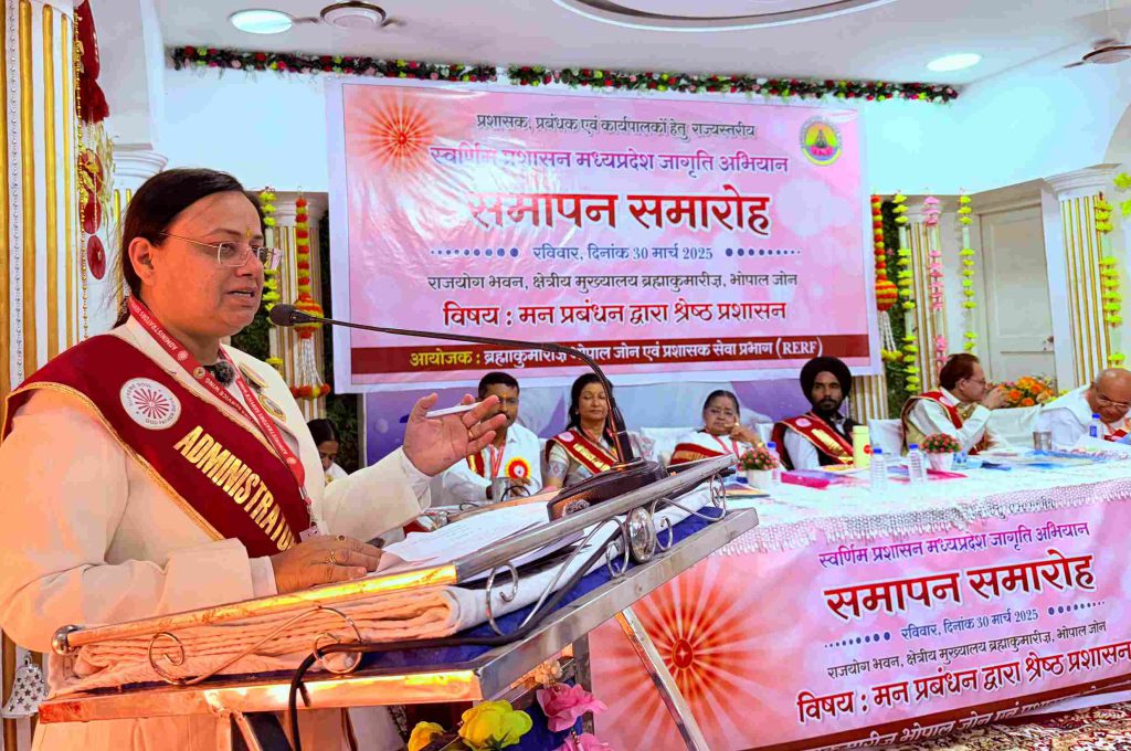 ‘आध्यात्मिक सशक्तिकरण द्वारा स्वच्छ एवं स्वस्थ समाज’ थीम के अंतर्गत ब्रह्माकुमारीज भोपाल ज़ोन के क्षेत्रीय मुख्यालय भोपाल में प्रशासकों, प्रबंधकों तथा कार्यपालकों हेतु “स्वर्णिम प्रशासन मध्यप्रदेश जागृति” राज्यस्तरीय अभियान का शुभारंभ मध्यप्रदेश के राज्यपाल माननीय मंगू भाई पटेल जी के द्वारा किया गया था । इस अवसर पर अभियान के अंतर्गत माननीय राज्यपाल महोदय ने विभिन्न यात्राओं का शुभारंभ किया था | अभियान के अंतर्गत यात्राओं के माध्यम से संपूर्ण मध्यप्रदेश के प्रशासकों, प्रबंधकों तथा कार्यपालकों हेतु विभिन्न कार्यक्रमों के माध्यम से उन्हे आध्यात्मिक रूप से सशक्त कर सुप्रशासन एवं स्वर्णिम मध्यप्रदेश बनाने हेतु सशक्त करने हेतु अनेक कार्यक्रम आयोजित किए गए |