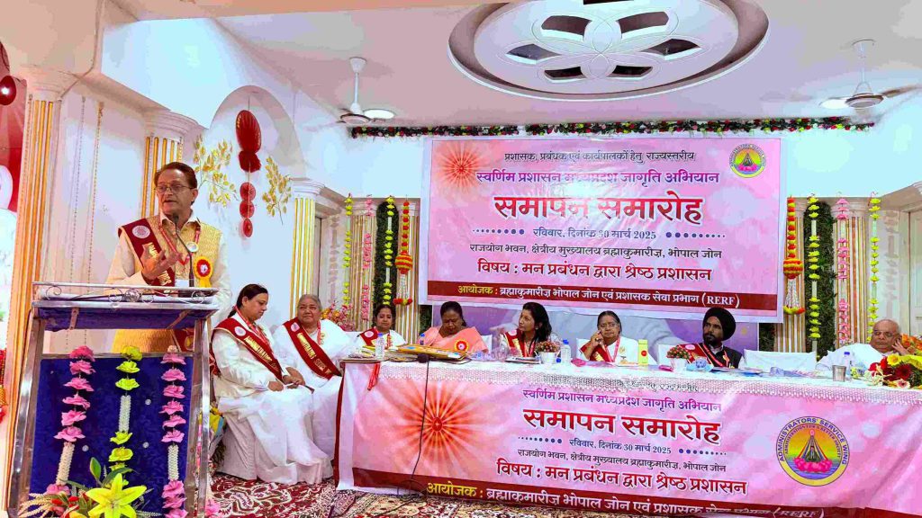 भोपाल,मध्य प्रदेश। प्रजापिता ब्रह्माकुमारी ईश्वरीय विश्व विद्यालय के प्रशासक सेवा प्रभाग के द्वारा स्वर्णिम प्रशासन मध्य प्रदेश राज्यस्तरीय जागृति अभियान राजयोगिनी ब्रह्माकुमारी अवधेश दीदी, क्षेत्रीय निदेशिका म.प्र. एवं राष्ट्रीय संयोजिका, प्रशासक सेवा प्रभाग एवं राजयोगी बी के हरीश भाई जी मुख्यालय संयोजक प्रशासक सेवा प्रभाग के कुशल मार्गदर्शन में एवं बीके डॉ. रीना दीदी, क्षेत्रीय संयोजिका, प्रशासक सेवा प्रभाग के नेतृत्व में समापन समारोह पर कार्यक्रम आयोजित किया गया। इस अवसर पर ब्रह्माकुमारीज भोपाल जोन के संस्थापक एवं प्रशासक सेवा प्रभाग के पूर्व अध्यक्ष स्वर्गीय राजयोगी महेंद्र भाई साहब की 16वीं पुण्य तिथि पर उन्हें श्रद्धा सुमन अर्पित किए गए। इस अवसर पर भोपाल जोन की सैकड़ो वरिष्ठ दीदियां उपस्थित रही।