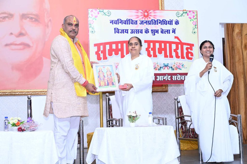 दुर्ग बघेरा (छ.ग) – आनंद सरोवर मे नव निर्वाचित जन प्रतिनिधीयों (सरपंच, जनपद सदस्यों, जनपद अध्यक्षों) के सम्मान समारोह के अवसर पर भ्राता ललित चंन्द्राकर जी ( विधायक दुर्ग ग्रामीण क्षेत्र) को ईश्वरीय सैगात भेंट करते हुए सेवा केन्द्र संचालिका रीटा बहन।