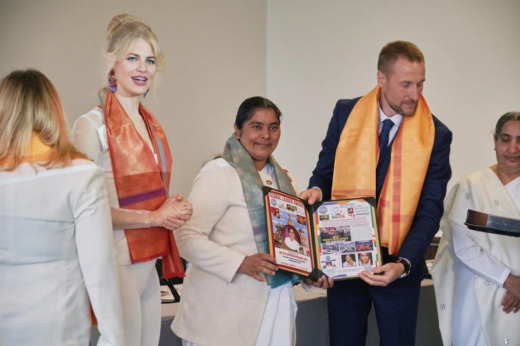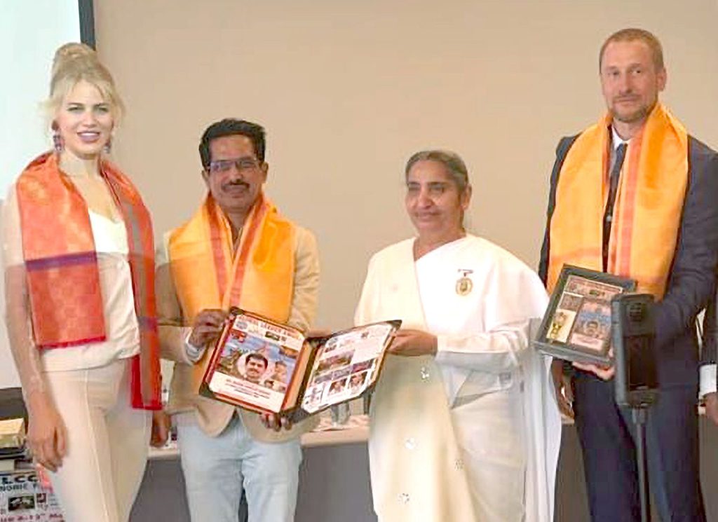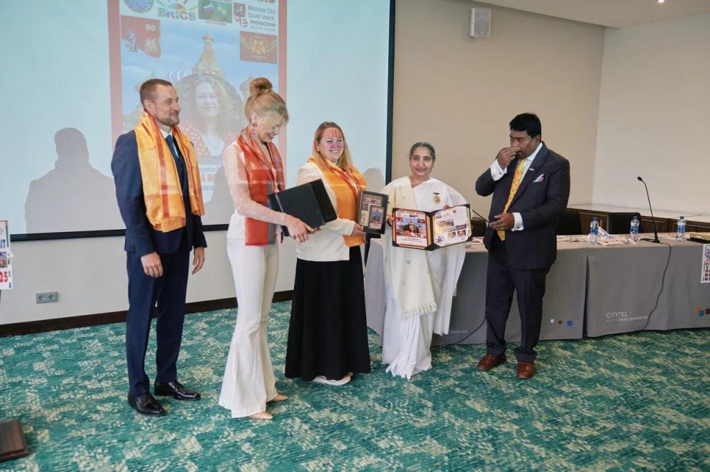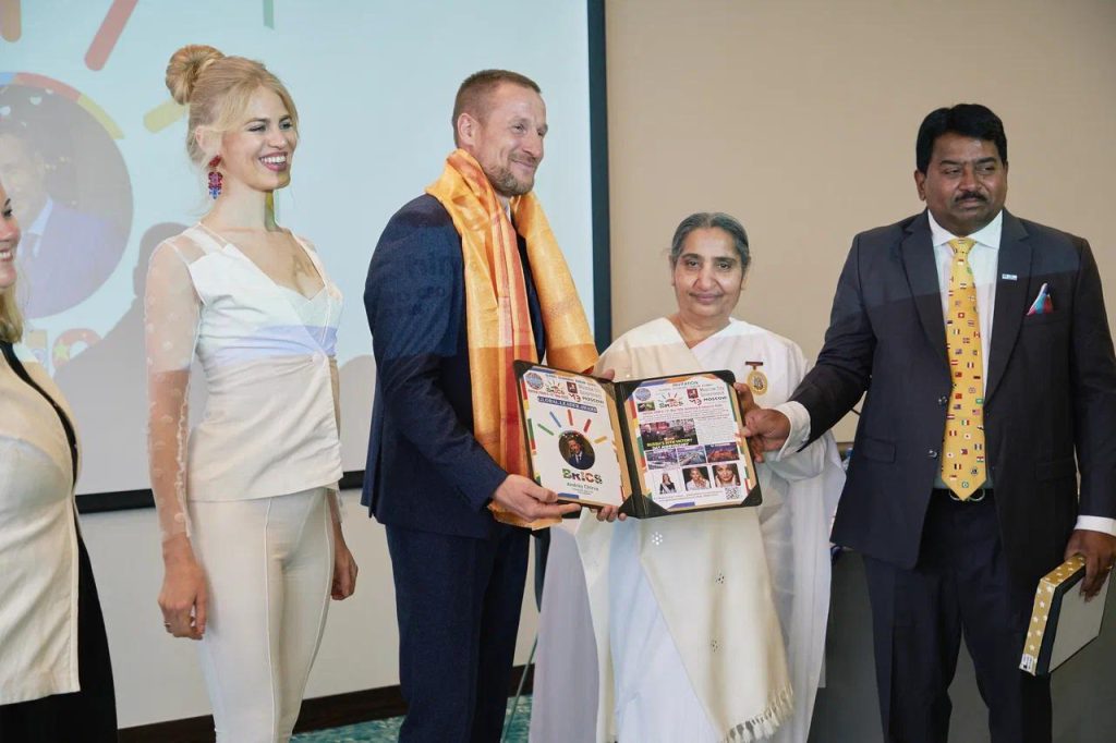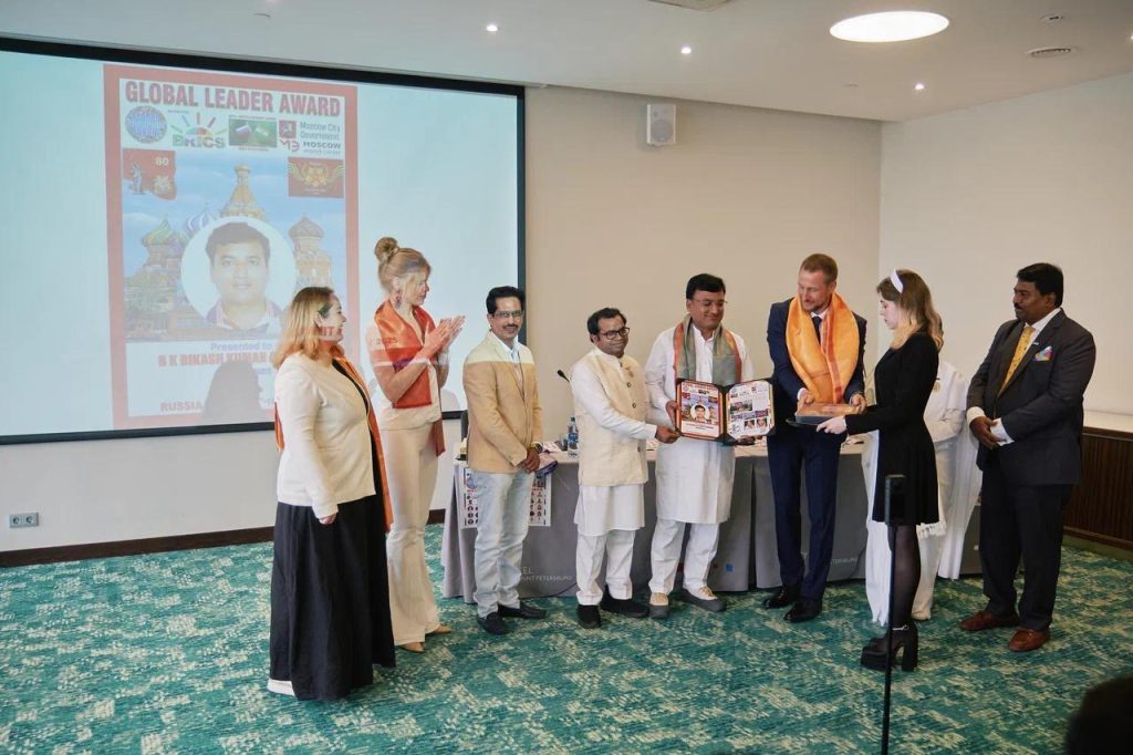 सेंट पिटर्सबर्ग, रशिया: सेंट पिटर्सबर्ग में आयोजित ग्लोबल ईकॅानॅामिक फोरम समिट में ब्रिक्स के सदस्य राष्ट्र के प्रतिनिधीयोके ऊपस्थिती में सेंट पिटर्सबर्ग के रिट्रीट सेंटर के डायरेक्टर बी के संतोष दीदी को ग्लोबल लिडर अवॅार्ड से सम्मानित किया गया। इस अवसर पर ग्लोबल ईकॅानॅामिक फोरम के अध्यक्ष हरिओम मारम, मिस रशिया वालेरिया अमिर, ब्रिक्स के गव्हर्निंग कमिटी मेंबर ॲन्ड्रयू चिरवा उपस्थित थे । बी के संतोष दीदी के हाथो से भारत से बी के डॅा दीपक हरके तथा अन्य अतिथीयों को ग्लोबल लिडर अवॅार्ड से सम्मानित किया। समिट में बी के डॅा सुवर्णा, बी के विकास को भी ग्लोबल लिडर अवॅार्ड से सम्मानित किया गया। संतोष दीदी ने सभी को संस्था की गतिविधीयो से अवगत कराकर राजयोग का परिचय दिया।