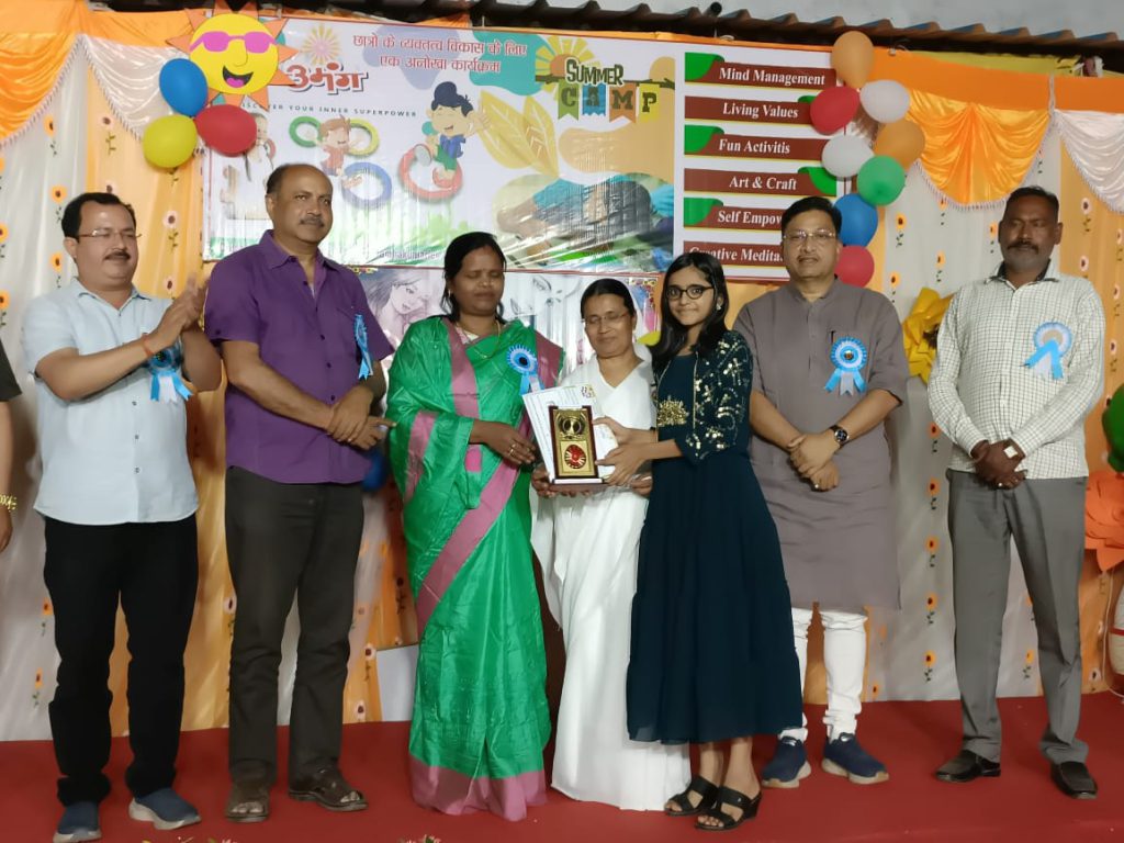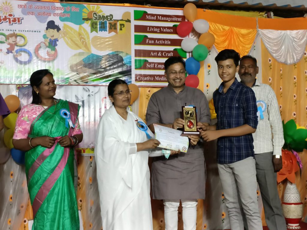 नगर निगम अंबिकापुर के एमआईसी मेंबर मनीष सिंह ने कहा कि अंबिकापुर शहर को ऐसे समर कैंप की और आवश्यकता है जिसमें बच्चे नैतिक मूल्य, संस्कार और अपनी संस्कृति के बारे में अच्छी बातें सीखें। कार्यक्रम में अतिथि के रूप में उपस्थित अंबिकापुर बार एसोसिएशन के सचिव विजय तिवारी एवं पूर्व पार्षद रिंकू वर्मा ने भी संबोधित कर अपनी शुभकामनाएं दी। तत्पश्चात मातृ दिवस के अवसर पर बच्चों ने अपनी मांओ को उपहार देकर उनका आशीर्वाद लिया। समर कैंप में आयोजित विभिन्न प्रतियोगिताओं में विजेता प्रतिभागियों को आकर्षक पुरस्कार एवं सर्टिफिकेट से सम्मानित किया गया। चित्रकारी प्रतियोगिता में अनुष्का शाह एवं आरोही अग्रवाल, निबंध प्रतियोगिता में साक्षी माली , कामिनी पैकरा एवं अदिति जायसवाल, भाषण प्रतियोगिता में कुमारी मानसी तथा क्विज में आर्यन सिंह एवं आशुतोष तिवारी ने प्रथम स्थान प्राप्त किया। समर कैंप में बेस्ट स्टूडेंट का खिताब कक्षा दसवीं के छात्र प्रणव पांडे एवं कक्षा आठवीं की छात्रा दीप शिखा पाठक ने जीता। कार्यक्रम में बड़ी संख्या में अभिभावक एवं नगरवासीयो ने उपस्थित होकर बच्चों का उत्साहवर्धन किया। ब्रह्माकुमारी विद्या बहन बताया कि आगामी 12 तारीख से अभिभावकों एवं विद्यार्थियों के लिए सात दिवसीय निशुल्क राजयोग मेडिटेशन शिविर का आयोजन किया जा रहा है जिसका समय प्रातः 9 से 10 एवं संध्या 7 से 8 है सभी अभिभावक एवं बच्चे किसी भी एक समय पर उपस्थित होकर के इस मेडिटेशन शिविर का लाभ ले सकते हैं।