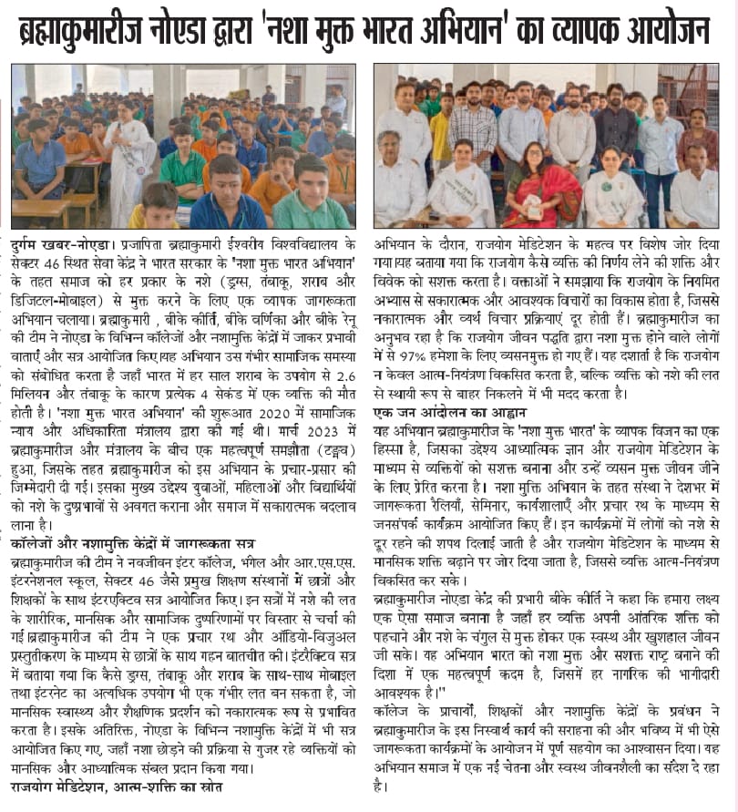 नोएडा,उत्तर प्रदेश: ओम शांति रिट्रीट सेंटर द्वारा नशा मुक्त भारत अभियान के अंतर्गत नोएडा के विभिन्न स्थलों- सरदारपुर, नवजीवन स्कूल सेक्टर 46, RSS इंटरनेशनल स्कूल, और अन्य खुले मैदानों में एक दिवसीय ध्यान एवं जागरूकता सत्रों का आयोजन किया गया। इन सत्रों में कुल 1130 लाभार्थियों (बच्चे: 530, युवा: 120, पुरुष: 256, महिलाएं: 149, वरिष्ठ नागरिक: 75) ने सहभागिता की। कार्यक्रम में प्रतिभागियों को विभिन्न प्रकार की लतों, जैसे तंबाकू, शराब, ड्रग्स और स्क्रीन एडिक्शन से होने वाले मानसिक, शारीरिक और सामाजिक दुष्प्रभावों के बारे में जागरूक किया गया। साथ ही, ध्यान, सकारात्मक सोच और स्वस्थ जीवनशैली को अपनाने के लाभों को विस्तार से समझाया गया। प्रतिभागियों ने नशे से दूर रहने और समाज को भी इसके प्रति जागरूक करने की सामूहिक शपथ ली।
