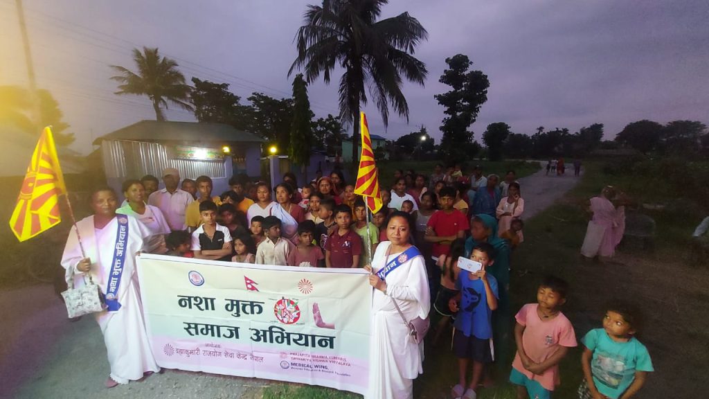 कतहरी,नेपाल: ब्रह्माकुमारी सेवाकेंद्र द्वारा नशा मुक्त भारत अभियान के अंतर्गत कतहरी चौक, नया बाजार, गडम गाछी, उड़ी पूल चौक (मुसहर बस्ती), खैद बोना और भोडाहा सहित छह स्थानों पर ध्यान एवं जागरूकता सत्रों का आयोजन किया गया, जिनमें कुल 1576 लाभार्थियों (बच्चे: 430, युवा: 185, पुरुष: 275, महिलाएं: 471, वरिष्ठ नागरिक: 215) ने सहभागिता की। इन कार्यक्रमों के माध्यम से नशे के विभिन्न प्रकारों तथा उनके मानसिक, शारीरिक, सामाजिक और नैतिक दुष्प्रभावों पर प्रकाश डाला गया। प्रतिभागियों को बताया गया कि नशे से बचने का प्रभावी उपाय आत्म-सशक्तिकरण, ध्यान और संतुलित जीवनशैली है। कार्यक्रमों के दौरान सभी ने आजीवन नशामुक्त रहने की प्रतिज्ञा ली और एक स्वस्थ, सशक्त समाज के निर्माण में योगदान देने की प्रेरणा प्राप्त की।