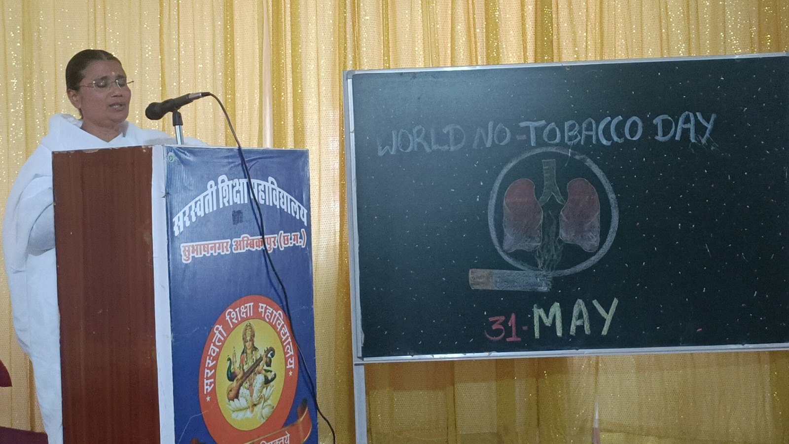 मुख्य अतिथि राजेश कुमार पाण्डेय सम्भागीय सेनानी ने अपने उद्बोधन में बताया कि तम्बाकू से हमारे शरीर मे बहुत सारे हार्मोनल परिवर्तन होते है, नशे से हमारा जीवन प्रभावित होता है, हमारी दैनिक दिनचर्या में परेशानी होने लगती है। साथ ही उन्होंने बताया कि तम्बाकू से हमारे शरीर के हर अंग को प्रभावित करता है अंबिकापुर सेवाकेंद्र संचालिका बी.के. विद्या दीदी ने कहा आज पूरे विश्व, राष्ट्र राज्य और गांव के विकास में विघ्न रूप जो समस्या है वह है व्यसन ।आज दुनिया में अनेकानेक कारणों से तनाव और चिंता बढ़ती ही जा रही है तनाव और चिंता से छुटकारा पाने के लिए मनुष्य अज्ञानता वश तंबाकू शराब, नशीली दवाइयां और विभिन्न प्रकार के नशीले द्रव्य पदार्थों का सहारा ले रहा है ,जिसके चलते मनुष्यों की नशीले पदार्थों के सेवन करने की आदत भी पक्की होती जा रही है। तंबाकू बहुत ही भयंकर चीज है तंबाकू से पूरे विश्व में हर वर्ष एक करोड़ लोगों की मृत्यु होती है भारत में हर वर्ष 10 लाख लोग मौत के शिकार होते हैं भारत में प्रतिदिन 3000 लोग तंबाकू के सेवन से होने वाले रोगों से मरते हैं यह तंबाकू बंदूक की सभी गोलियां सभी वायरस से भी ज्यादा खौफनाक है। उन्होंने तंबाकू की उत्पत्ति कैसे हुई यह बताया और कहा कि आज से 250 साल पहले अंग्रेज तंबाकू बेचकर धन कमाने के लिए उसे भारत ले आए ऐसे शिक्षित माने जाने वाले अंग्रेजों ने सिर्फ धन के लालच में आकर अनपढ़ और आदिवासी प्रजा को तंबाकू का गुलाम बनाया। इसके अतिरिक्त उन्होंने विभिन्न कहानियों के माध्यम से तंबाकू से होने वाले नुकसान के बारे में विस्तार से बताया। उन्होंने नशा से मुक्त होने के उपाय बताते हुए कहा कि जैसे रोग की दवाई से रोग मुक्त हो जाते हैं ऐसे ही सभी प्रकार के व्यसनो से मुक्त होने का सहज रास्ता राजयोग रूपी आध्यात्मिक दवाई है। जैसे उपचार के लिए अस्पताल में जाना पड़ता है ऐसे ब्रह्माकुमारी संस्था के किसी भी सेवा केंद्र पर