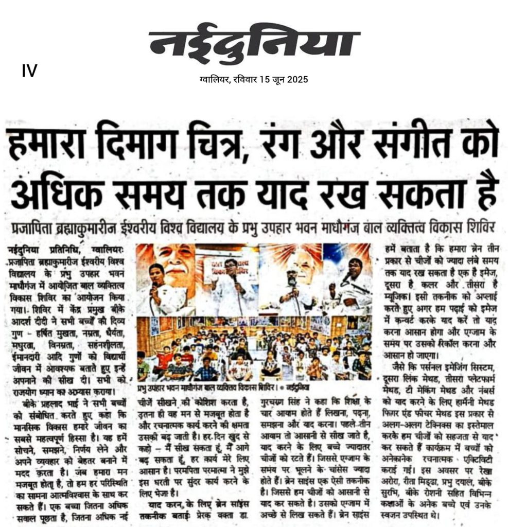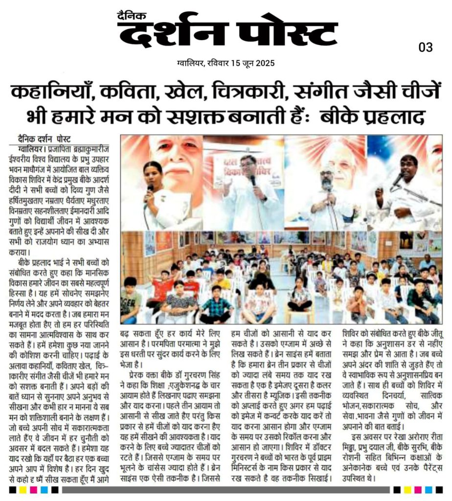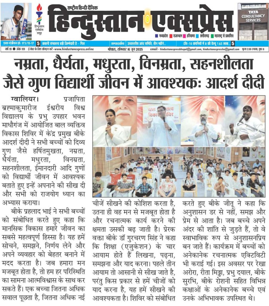 ग्वालियर,मध्य प्रदेश। प्रजापिता ब्रह्माकुमारीज ईश्वरीय विश्व विद्यालय के प्रभु उपहार भवन माधौगंज में आयोजित बाल व्यक्तिव विकास शिविर में केंद्र प्रमुख बीके आदर्श दीदी ने सभी बच्चों को दिव्य गुण जैसे – हर्षितमुखता, नम्रता, धैर्यता, मधुरता, विनम्रता, सहनशीलता, ईमानदारी आदि गुणों को विद्यार्थी जीवन में आवश्यक बताते हुए इन्हें अपनाने की सीख दी और सभी को राजयोग ध्यान का अभ्यास कराया।