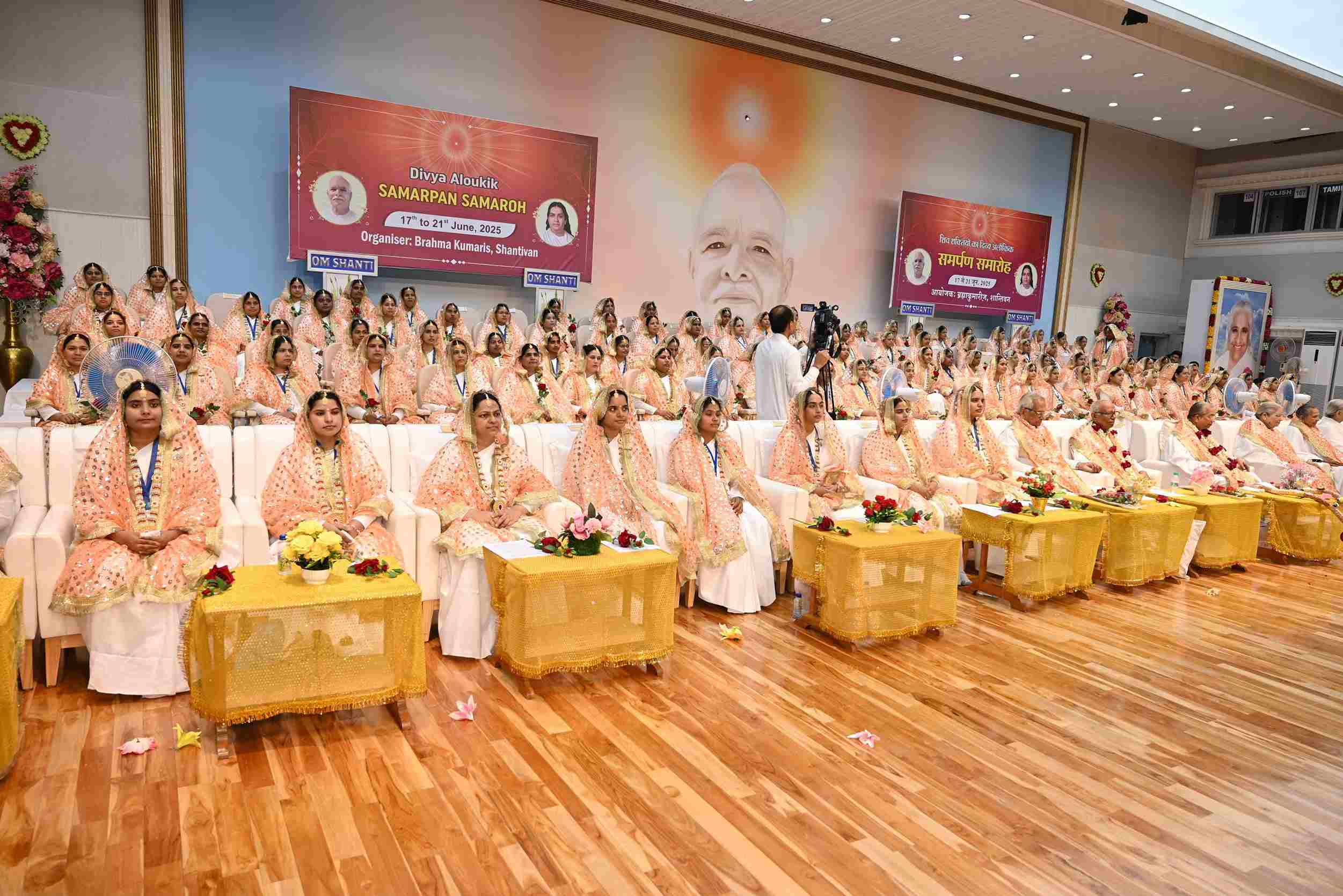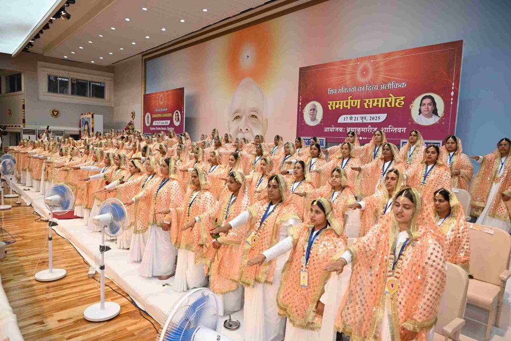 आबू रोड, राजस्थान। सौ बेटियां अध्यात्म की राह पर चलते हुए शिवप्रिया बन गईं। शिवलिंग को वरमाला पहनाकर परमात्मा शिव बाबा को अपना जीवनसाथी बनाया और आजीवन ब्रह्मचर्य व्रत का संकल्प लिया। मौका था ब्रह्माकुमारीज़ संस्थान के अंतरराष्ट्रीय मुख्यालय शांतिवन में आयोजित अलौकिक दिव्य समर्पण समारोह का। इसमें देशभर से उच्च शिक्षित बीए, एमए, एमकॉम, डॉक्टरेट बेटियों ने अपने माता-पिता और परिजन के सामने संयम पथ पर चलने और ईश्वरीय सेवा का संकल्प लिया। इस महासमर्पण के पांच हजार से अधिक लोग साक्षी बने।