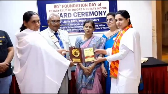 इंदौर, मध्य प्रदेश । रोटरी क्लब के 80 वर्ष पूरे होने के उपलक्ष में समाज की विभिन्न विभूतियों का सम्मान किया गया, इसमें आध्यात्मिक और योग क्षेत्र में विशेष योगदान के लिए ओम शांति इंदौर की ब्रह्माकुमारी आयुषी बहन का रोटरी क्लब के प्रेसिडेंट राकेश बमोरिया ने मोमेंटो देकर सम्मानित किया।