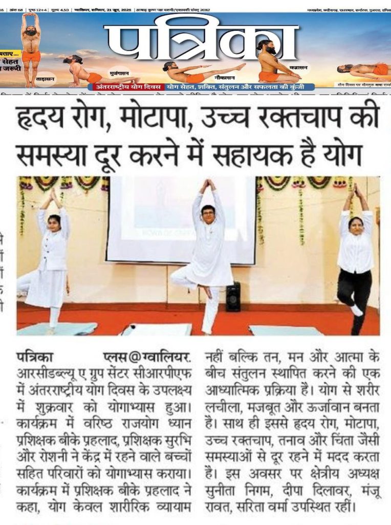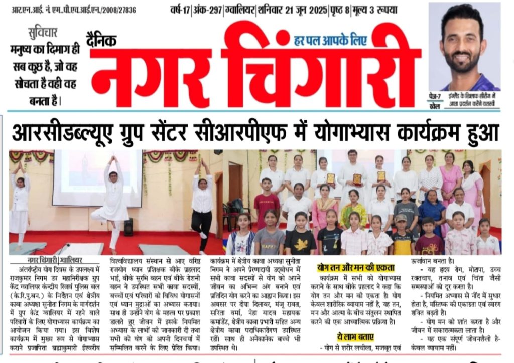 ग्वालियर,मध्य प्रदेश। इस वर्ष अंतर्राष्ट्रीय योग दिवस के उपलक्ष्य में आज श्री राजकुमार निगम उप महानिरीक्षक ग्रुप केंद्र ग्वालियर केन्द्रीय रिज़र्व पुलिस बल (के.रि.पु.ब.) के निर्देशन एवं क्षेत्रीय कावा अध्यक्षा श्रीमती सुनीता निगम के मार्गदर्शन में ग्रुप केंद्र, ग्वालियर में रहने वाले परिवारों के लिए योगाभ्यास कार्यक्रम का आयोजन किया गया।