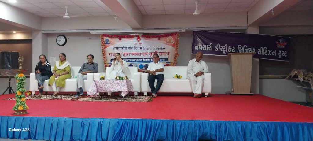 नवसारी सेवा केंद्र द्वारा 21 जून आंतरराष्ट्रीय योग दिवस पर आयोजित “राजयोग द्वारा स्वस्थ एवम् सुखी समाज” विशेष योग कार्यक्रम में सभी को योग का महत्व समझाते हुए आदरणीय राजयोगिनी गीतादीदीजी।