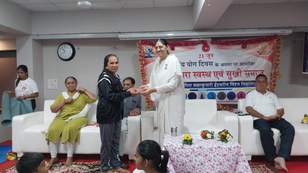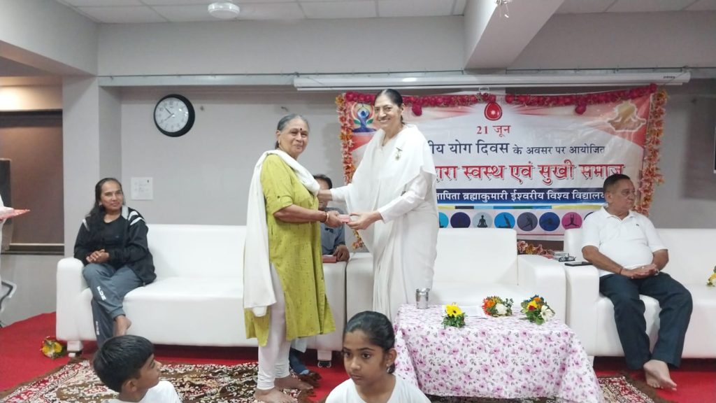 21 जून आंतरराष्ट्रीय योग दिवस पर आयोजित “राजयोग द्वारा स्वस्थ एवं सुखी समाज” विशेष योग कार्यक्रम में आमंत्रित योग प्रशिक्षिका पारुलबहन जादव को सौगात देते हुए आदरणीय राजयोगिनी गीतादीदीजी।