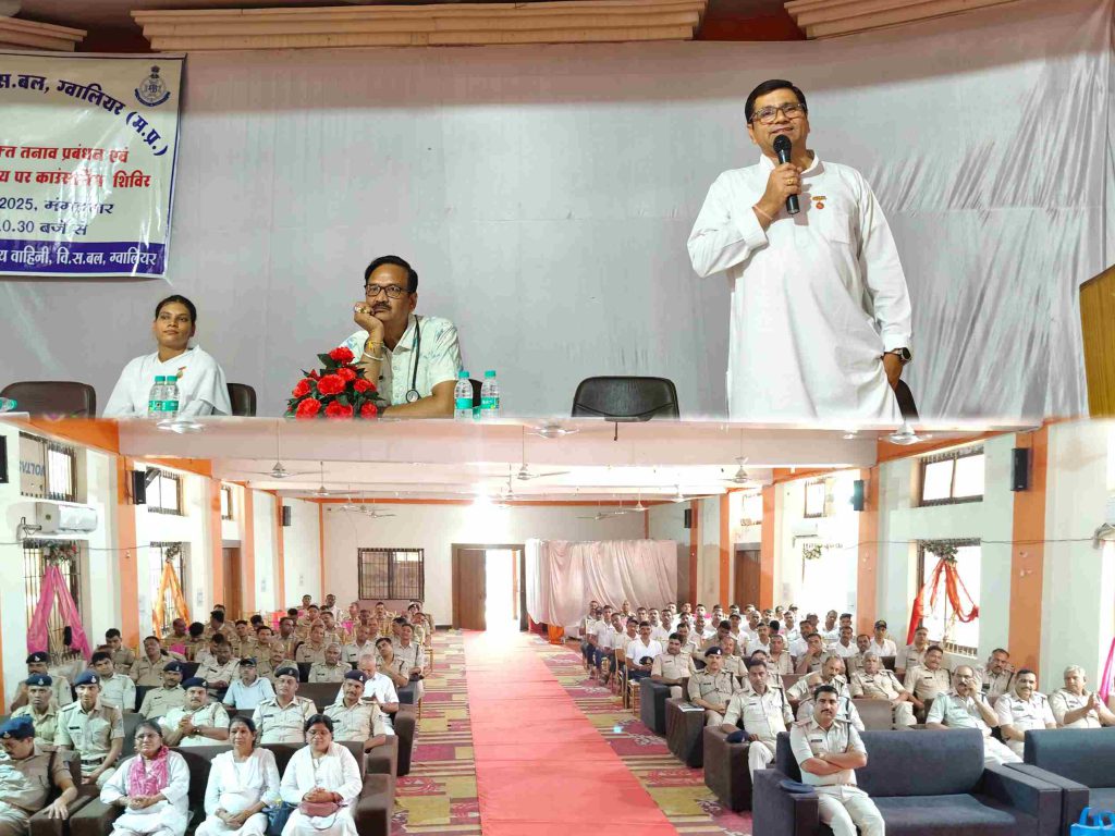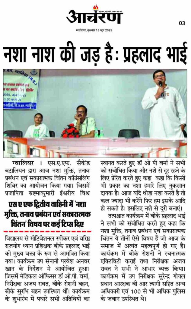 ग्वालियर,मध्य प्रदेश। द्वितीय वाहिनी विशेष सशस्त्र बल नशा मुक्ति, तनाव प्रबंधन एवं सकारात्मक चिंतन काउंसलिंग शिविर का आयोजन किया गया। जिसमें प्रजापिता ब्रह्माकुमारी ईश्वरीय विश्व विद्यालय से मोटिवेशनल स्पीकर एवं वरिष्ठ राजयोग ध्यान प्रशिक्षक बीके प्रहलाद भाई को मुख्य वक्ता के रूप से आमंत्रित किया गया। कार्यक्रम उप सेनानी परवेश अनवर खान के निर्देशन मे आयोजित हुआ। जिसमें मेडिकल ऑफिसर डॉ ओ.पी. वर्मा, निरीक्षक अजय रावत, बीके रोशनी बहन, बीके सुरभि बहन उपस्थित थीं।