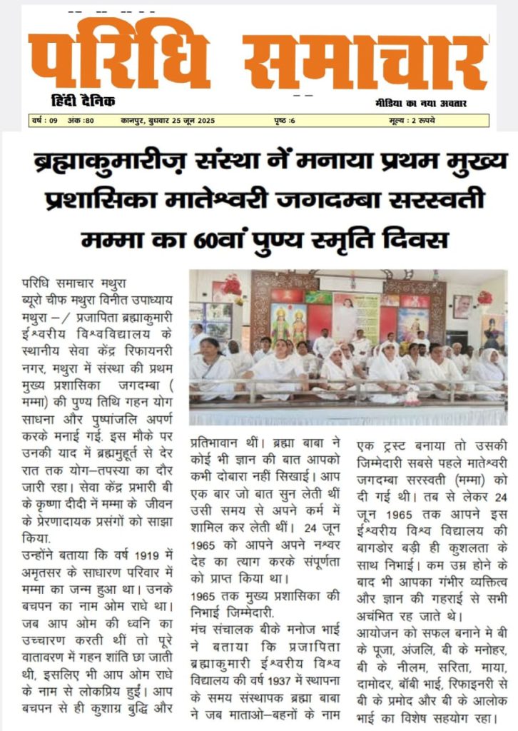मथुरा, उत्तर प्रदेश: आज प्रजापिता ब्रह्माकुमारी ईश्वरीय विश्वविद्यालय के स्थानीय सेवा केंद्र रिफायनरी नगर में संस्था की प्रथम मुख्य प्रशासिका जगदम्बा ( मम्मा) की पुण्य तिथि गहन योग साधना और पुष्पांजलि अपर्ण करके मनाई गई. इस मौके पर उनकी याद में ब्रह्ममुहूर्त से देर रात तक योग-तपस्या का दौर जारी रहा। सेवा केंद्र प्रभारी बी के कृष्णा दीदी नें मम्मा के जीवन के प्रेरणादायक प्रसंगों को साझा किया।