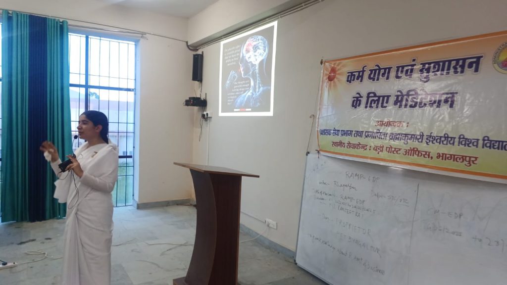 भागलपुर, बिहार। प्रजापिता ब्राह्माकुमारी ईश्वरीय विश्व विद्यालय , शाखा के सभागार में बी के अनीता दीदी के नेतृत्व में ” कर्मयोग एवं सुशासन के लिए मेडिटेशन ” विषय पर कार्यक्रम आयोजित किया गया l