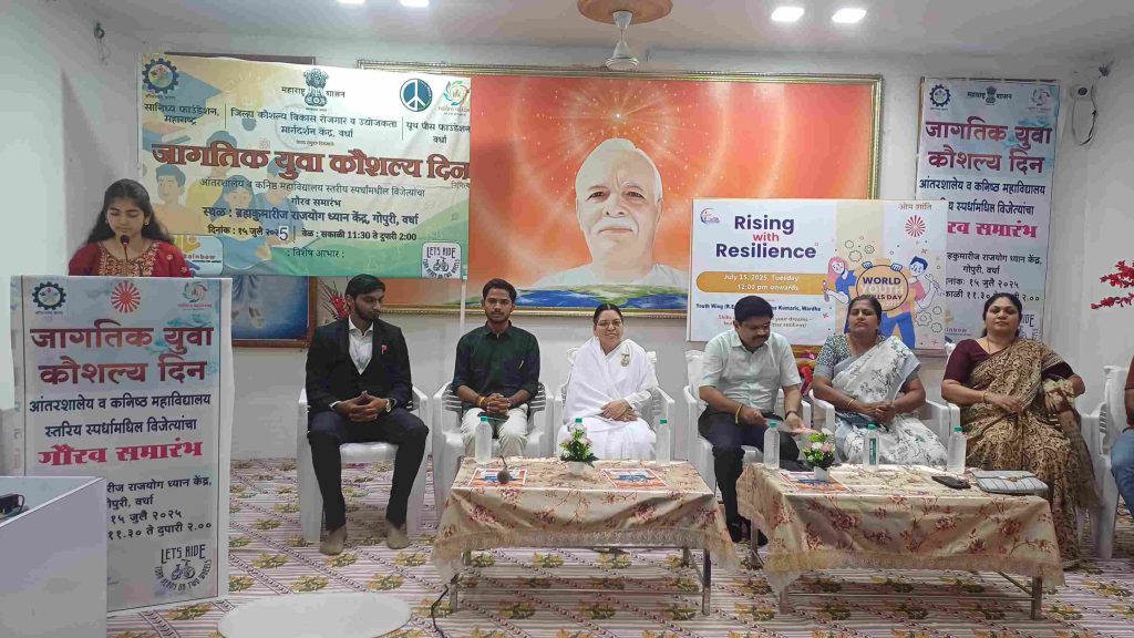वर्धा, महाराष्ट्र। जागतिक युवा कौशल्य दिन के निमित ब्रह्माकुमारिज सेवाकेन्द्र पर भव्य मार्गदर्शन और गौरव सम्मान कार्यक्रम आयोजित किया गया। इस अवसर पर मा. पराग सोमन, मुख्य कार्यकारी अधिकारी, जिल्हा परिषद वर्धा, मुख्य अतिथी सौ. वैशालीताई येराभार, माजी उपाध्यक्ष, जिल्हा परिषद वर्धा, तथा विशेष अतिथी प्रथम गुप्ता, संस्थापक व मुख्य कार्यकारी अधिकारी, Let’s Ride India, आयोजक सौ. नीता अवघड, सहाय्यक आयुक्त, जिल्हा कौशल्य विकास व रोजगार मार्गदर्शन केंद्र, एडवोकेट चैतन्य देव, उपाध्यक्ष, युथ पीस फाउंडेशन, कार्यक्रम के अध्यक्ष ब्रह्माकुमारी माधुरी बहेन, सेवाकेन्द्र संचालिका, ब्रह्माकुमारिज वर्धा, इत्यादि उपस्थिती थे ।