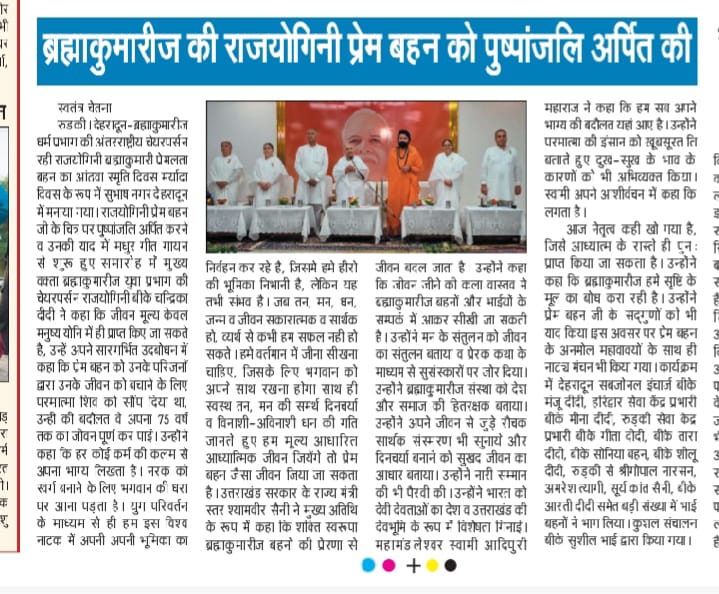 देहरादून,उत्तराखंड: ब्रह्माकुमारीज धर्म प्रभाग की अंतरराष्ट्रीय चेयरपर्सन रही राजयोगिनी ब्रह्माकुमारी प्रेम बहन का आंठवा स्मृति दिवस ‘मर्यादा दिवस’ के रूप में सुभाष नगर देहरादून में मनाया गया।राजयोगिनी प्रेम बहन जी के चित्र पर पुष्पांजलि अर्पित करने व उनकी याद में मधुर गीत गायन से शुरू हुए समारोह में मुख्य वक्ता ब्रह्माकुमारीज (R.E.R.F) के युवा प्रभाग की चेयरपर्सन राजयोगिनी बीके चन्द्रिका दीदी ने कहा कि जीवन मूल्य केवल मनुष्य योनि में ही प्राप्त किए जा सकते है।उन्हें अपने सारगर्भित उदबोधन में कहा कि प्रेम बहन को उनके परिजनों द्वारा उनके जीवन को बचाने के लिए परमात्मा शिव को सौंप दिया था,उन्ही की बदौलत वे अपना 75 वर्ष तक का जीवन पूर्ण कर पाई।उन्होंने कहा कि हर कोई कर्म की कलम से अपना भाग्य लिखता है।नरक को स्वर्ग बनाने के लिए भगवान को धरा पर आना पड़ता है।युग परिवर्तन के माध्यम से ही हम इस विश्व नाटक में अपनी अपनी भूमिका का निर्वहन कर रहे है।जिसमे हमे हीरो की भूमिका निभानी है।लेकिन यह तभी संभव है जब तन,मन,धन,जन्म व जीवन सकारात्मक व सार्थक हो,व्यर्थ से कभी हम सफल नहीं हो सकते।हमे वर्तमान में जीना सीखना चाहिए, जिसके लिए भगवान को अपने साथ रखना होगा।साथ ही स्वस्थ तन,मन की समर्थ दिनचर्या व विनाशी-अविनाशी धन की गति जानते हुए हम मूल्य आधारित आध्यात्मिक जीवन जियेंगे तो प्रेम बहन जैसा जीवन जिया जा सकता है।