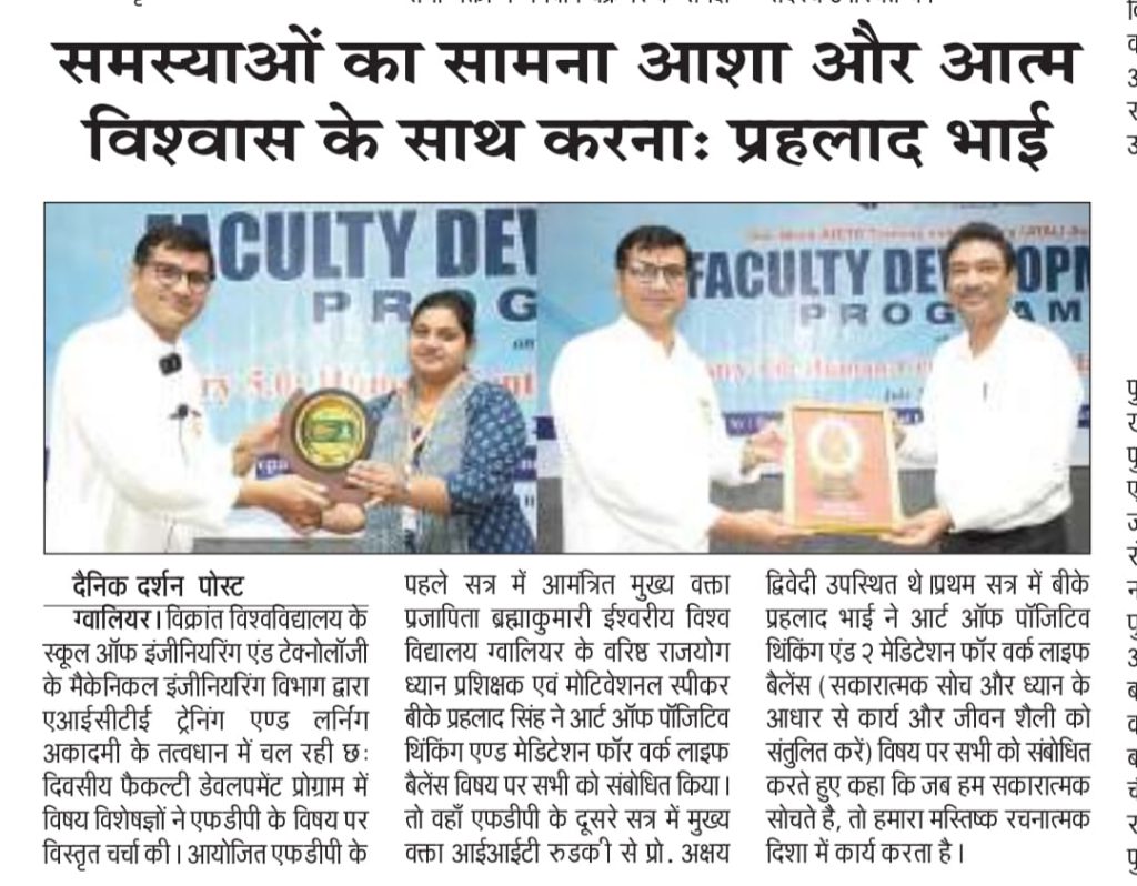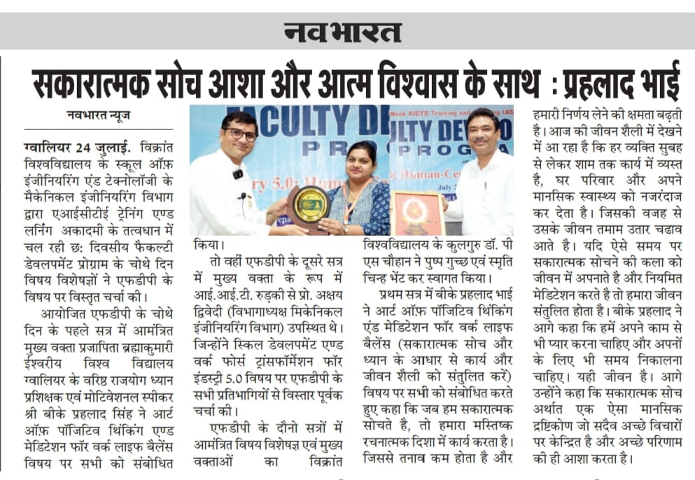 आयोजित एफडीपी के चोथे दिन के पहले सत्र में आमंत्रित मुख्य वक्ता प्रजापिता ब्रह्माकुमारी ईश्वरीय विश्व विद्यालय ग्वालियर के वरिष्ठ राजयोग ध्यान प्रशिक्षक एवं मोटिवेशनल स्पीकर श्री बीके प्रहलाद सिंह ने “आर्ट ऑफ़ पॉजिटिव थिंकिंग एण्ड मेडिटेशन फॉर वर्क लाइफ बैलेंस” विषय पर सभी को संबोधित किया।