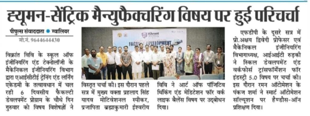 ग्वालियर,मध्य प्रदेश। विक्रांत विश्वविद्यालय के स्कूल ऑफ़ इंजीनियरिंग एंड टेक्नोलॉजी के मैकेनिकल इंजीनियरिंग विभाग द्वारा एआईसीटीई ट्रेनिंग एण्ड लर्निंग (ATAL) अकादमी के तत्वधान में चल रही छः दिवसीय फैकल्टी डेवलपमेंट प्रोग्राम के चोथे दिन विषय विशेषज्ञों ने एफडीपी के विषय पर विस्तृत चर्चा की।