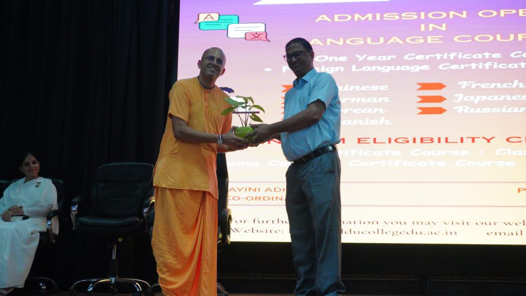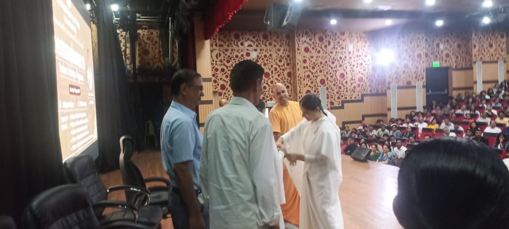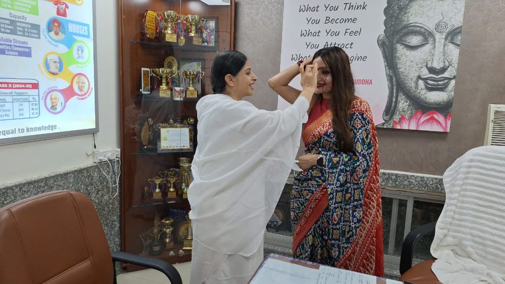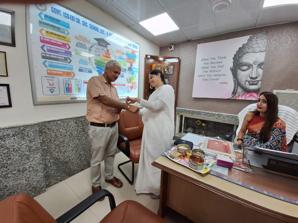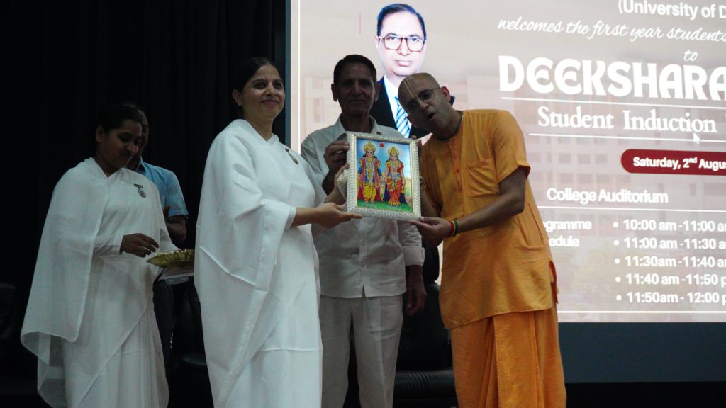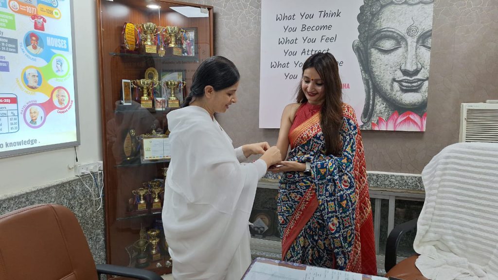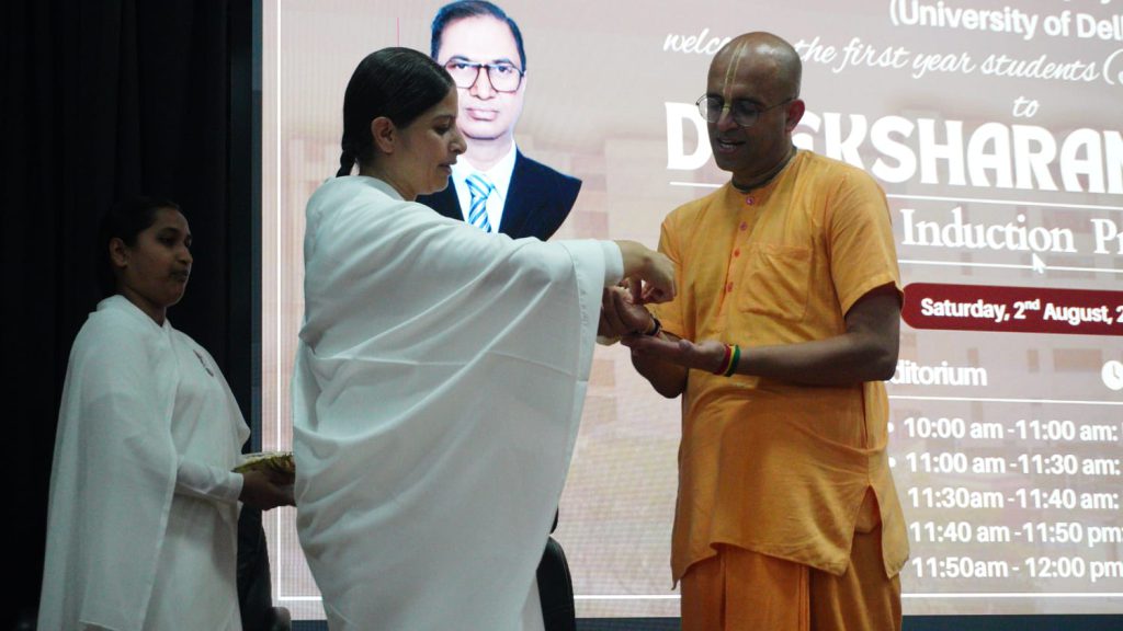 दीन दयाल उपाध्याय कॉलेज में बी के प्रियंका बहन संत अमोघ लीला दास जी को राखी बांधती हुईं, जो इस कार्यक्रम में वक्ता के रूप में शामिल हुए।