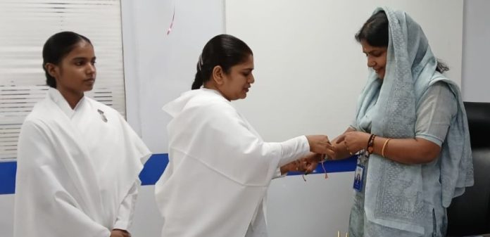 हाजीपुर नया टोला-मणिपुर: स्टेट बैंक ऑफ़ इंडिया के हाजीपुर शाखा में हाजीपुर नया टोला की संचालिका ब्रह्माकुमारी आरती बहन जी के द्वारा शाखा प्रबंधक वीणा कुमारी जी की उपस्थिति में दिनांक 01-08-2025 को रक्षाबंधन का पर्व मनाया गया | हाजीपुर शाखा प्रबंधक वीणा कुमारी जी को ब्रह्माकुमारी आरती बहन जी ने परमात्म रक्षा सूत्र बांधी |