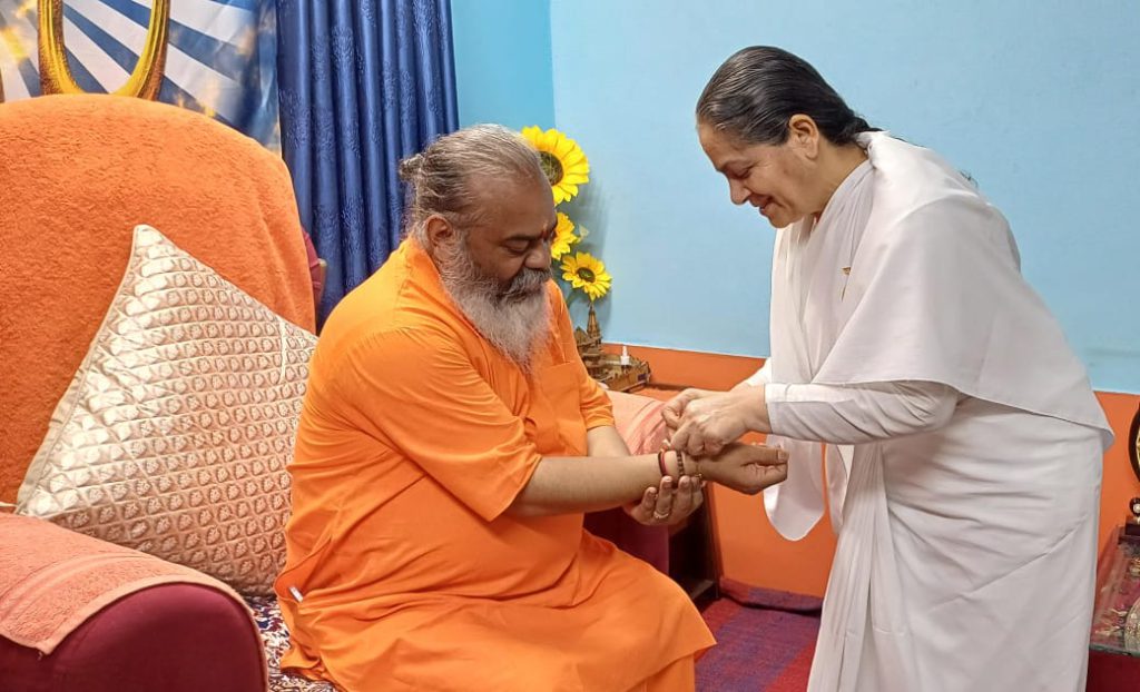 देहरादून स्थित टपकेश्वर महादेव मंदिर के 108 महंत कृष्णा गिरि महाराज जी को राखी बाँधते हुए ब्रह्मकुमारी मीना दीदी जी।