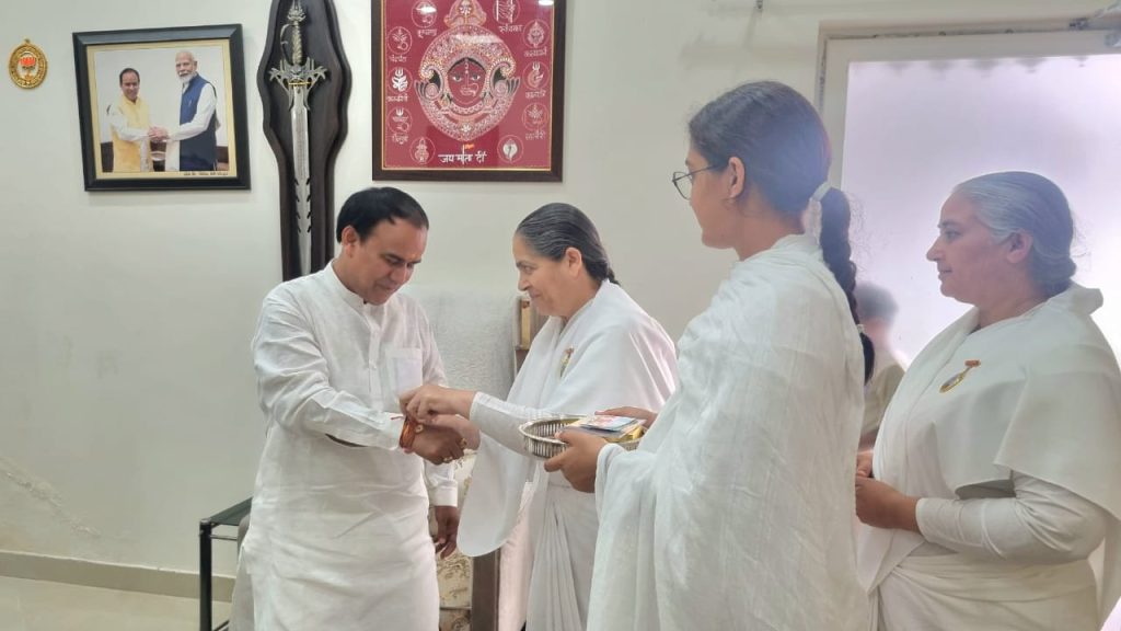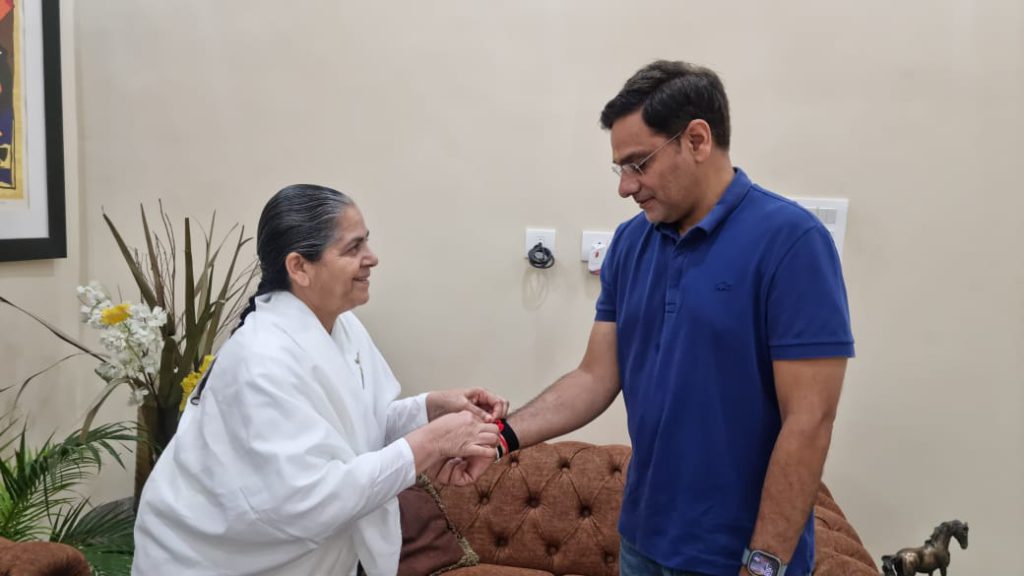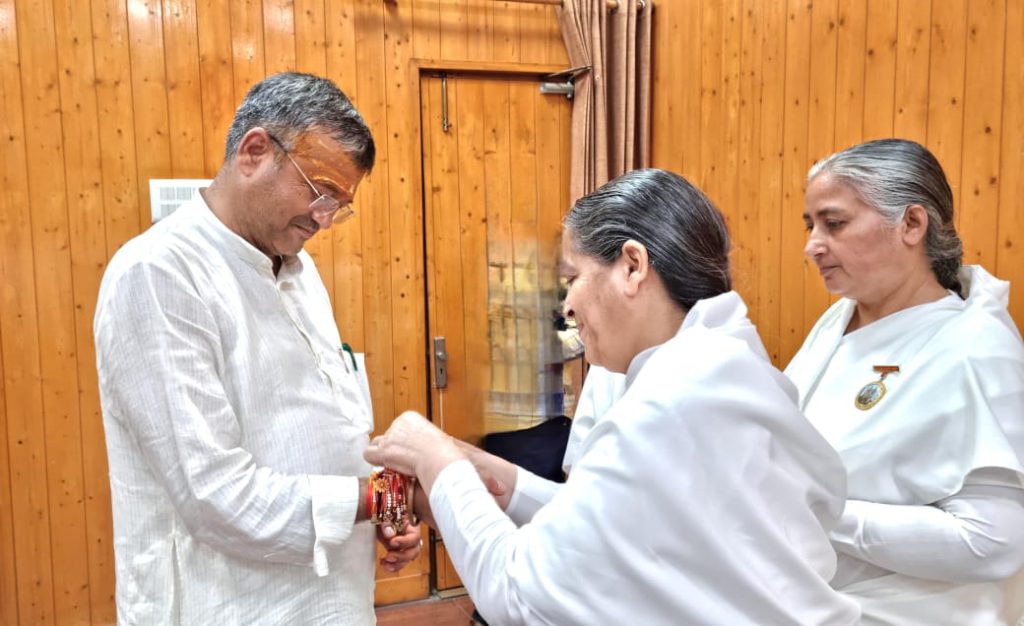 -उत्तराखण्ड के माननीय कैबिनेट मंत्री, श्री सौरभ बहुगुणा जी को राखी बाँधते हुए बी.के मीना दीदी जी।