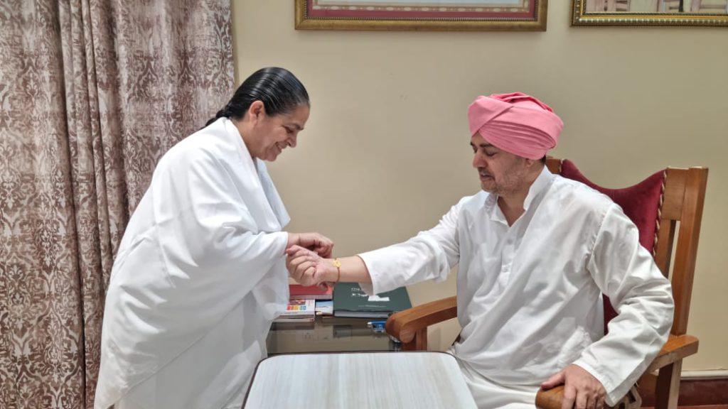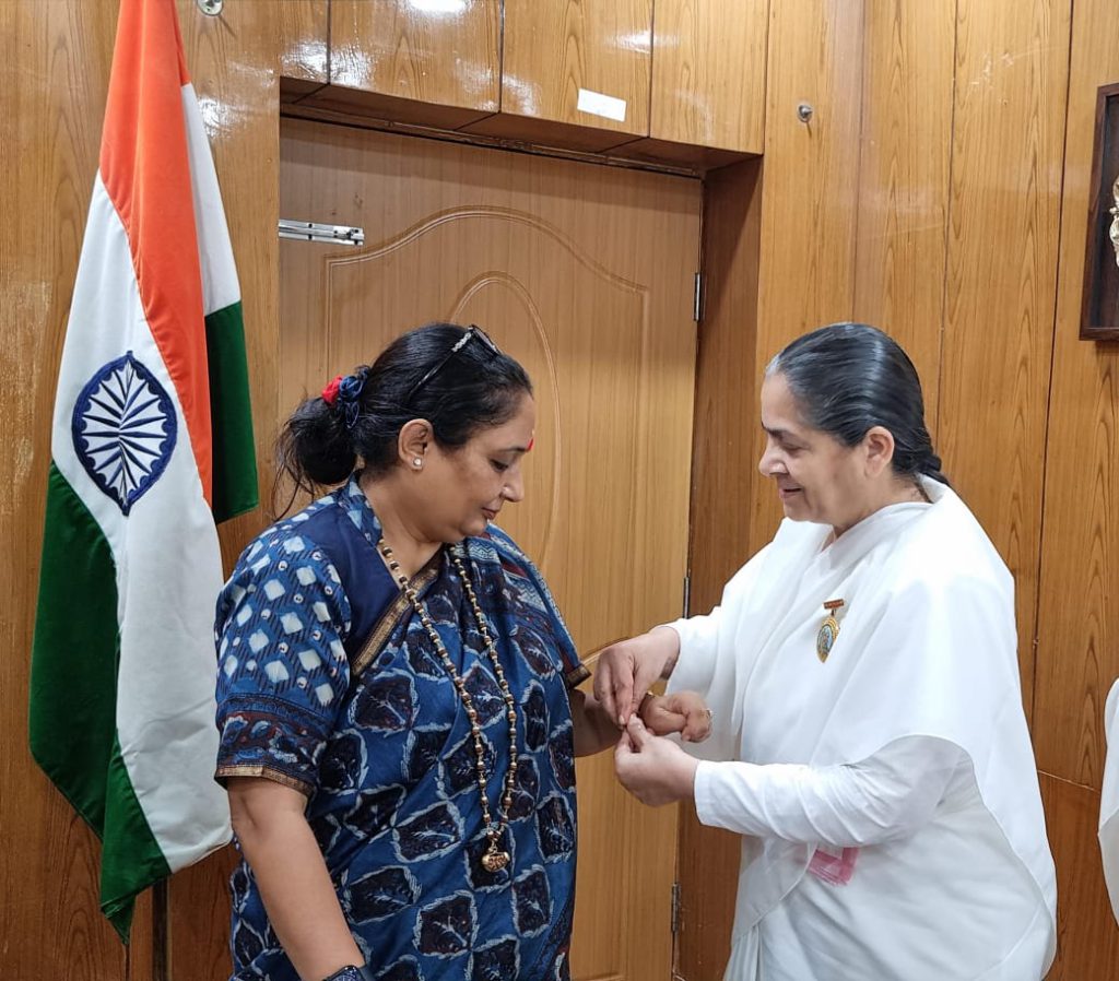 उत्तराखंड के राज्यपाल लेफ्टिनेंट जनरल गुरमीत सिंह जी को राखी बांधते हुए मंजू दीदी साथ में मीना दीदी और अन्य