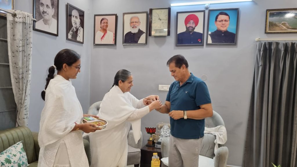 उत्तराखण्ड के माननीय स्वास्थ्य और उच्च शिक्षा मंत्री,डा० धन सिंह रावत जी को राखी बाँधते हुए बी.के मीना दीदी जी साथ में हैं बी.के गीता दीदी जी और अन्य।