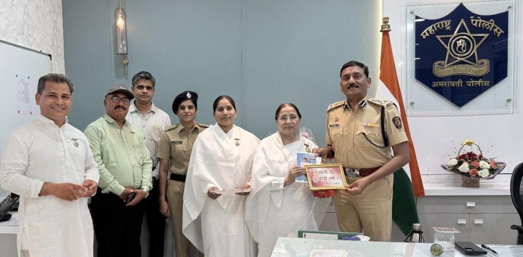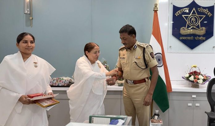 अमरावती,महाराष्ट्र :- आदरणीय महानगर पुलिस आयुक्त श्री अरविंद चावरिया जी को राखी बाँधते हुए ब्रह्माकुमारी सीता दीदी साथ में है बी के रूपाली दीदी, और ईश्वरीय सौग़ात देते हुए साथ में है बी के डॉक्टर उल्हास भाई, बी के प्रमोद भाई,बी के अमरनाथ भाई।