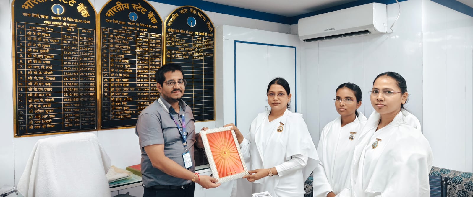 पटना सिटी हाजीगंज,बिहार: भारतीय स्टेट बैंक के पटना सिटी शाखा के शाखा प्रबंधक आदिल शादाब जी तथा सभी स्टाफ सहित 15 लोगों को, पटना सिटी गुलजारबाग सेवा केंद्र संचालिका ब्रह्मा कुमारी रानी बहन जी तथा पटना सिटी हाजीगंज सेवाकेंद्र संचालिका ब्रह्मा कुमारी बबीता बहन जी के द्वारा परमात्म रक्षा सूत्र बांधा गया ।