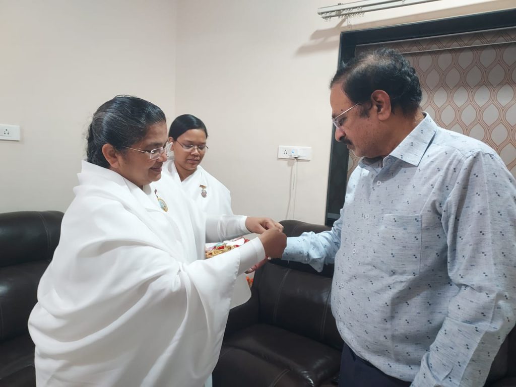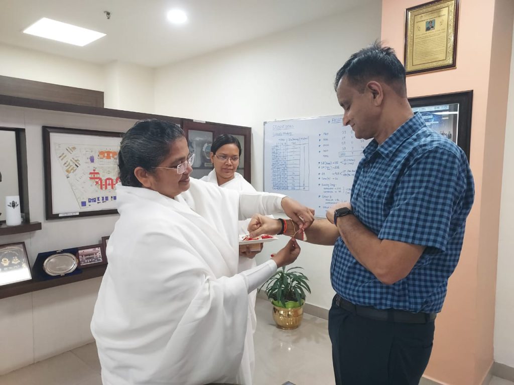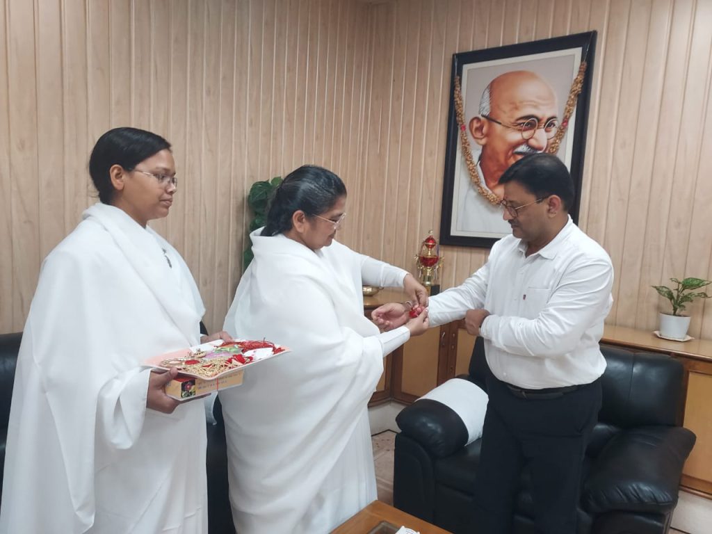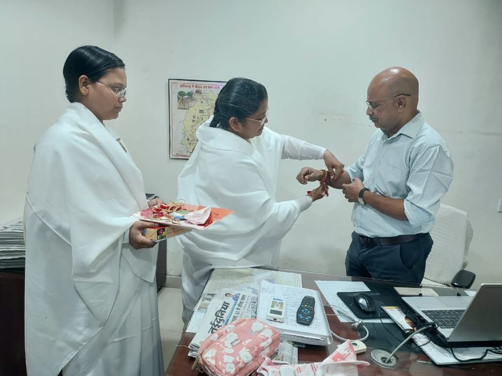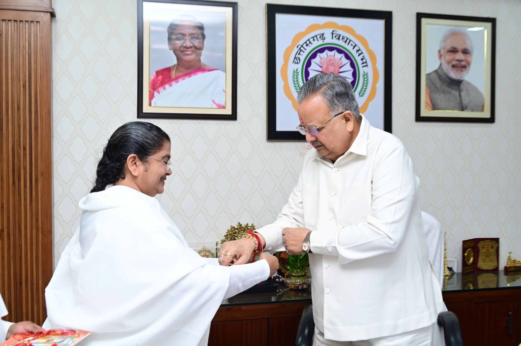 रायपुर, छत्तीसगढ़: रक्षाबंधन के शुभ अवसर पर प्रजापिता ब्रह्मकुमारी ईश्वरीय विश्वविद्यालय, रायपुर की संचालिका ब्रह्मकुमारी सविता बहन ने मुख्यमंत्री श्री विष्णु देव साय से उनके निवास कार्यालय में सौजन्य भेंट की और उन्हें रक्षा-सूत्र बाँधकर उनके स्वास्थ्य, दीर्घायु और सुखद जीवन की मंगलकामना की।