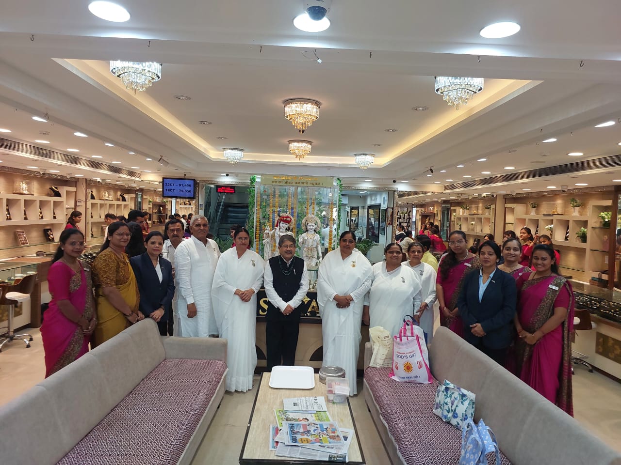 गणदेवीकर ज्वेलर्स के मालिक सुनिलभाई को राखी बाँधने के प्रश्चात ग्रुप फोटो – मेनेजर,स्टाफ मेम्बर्स, बीके बहने सरिता बहन,सुनीता बहन, निला बहन,वंदना बहन, नरेन्द्र भाई आदि l