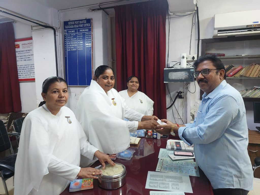 पोस्ट ऑफिस स्टाफ को राखी का महत्व समझाते हुए बीके सरिता बहन साथ मे निला बहन,वंदना बहन, नरेन्द्र भाई आदि l