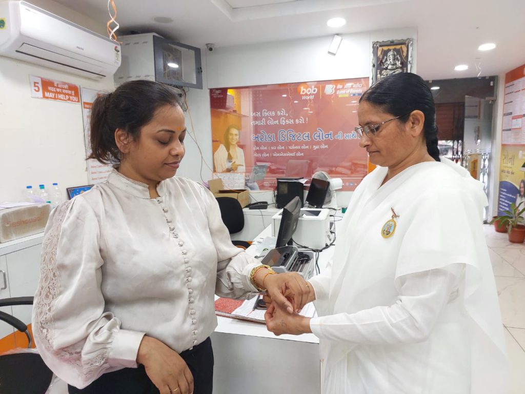 बैंक ऑफ़ बरोडा के मेनेजर को राखी बाँधते हुए बीके सुनीता बहन,निला बहन l