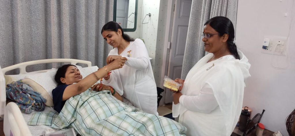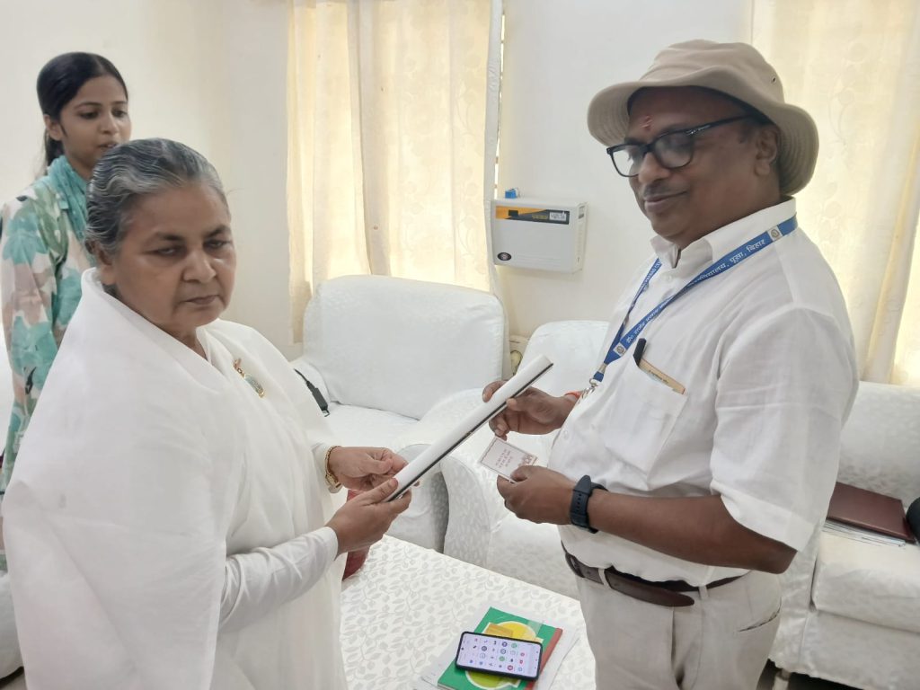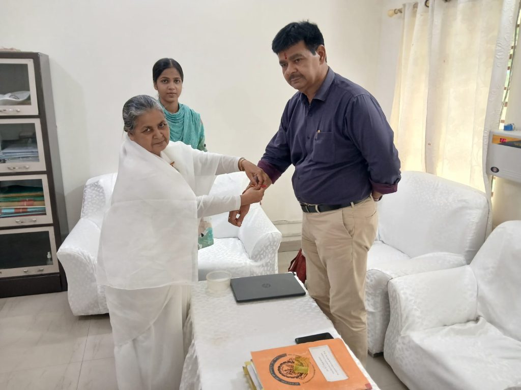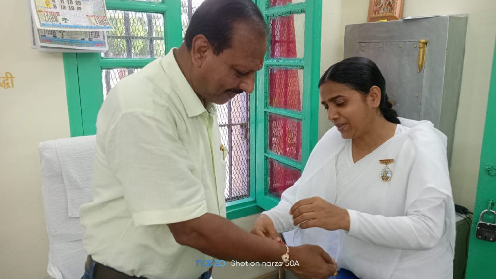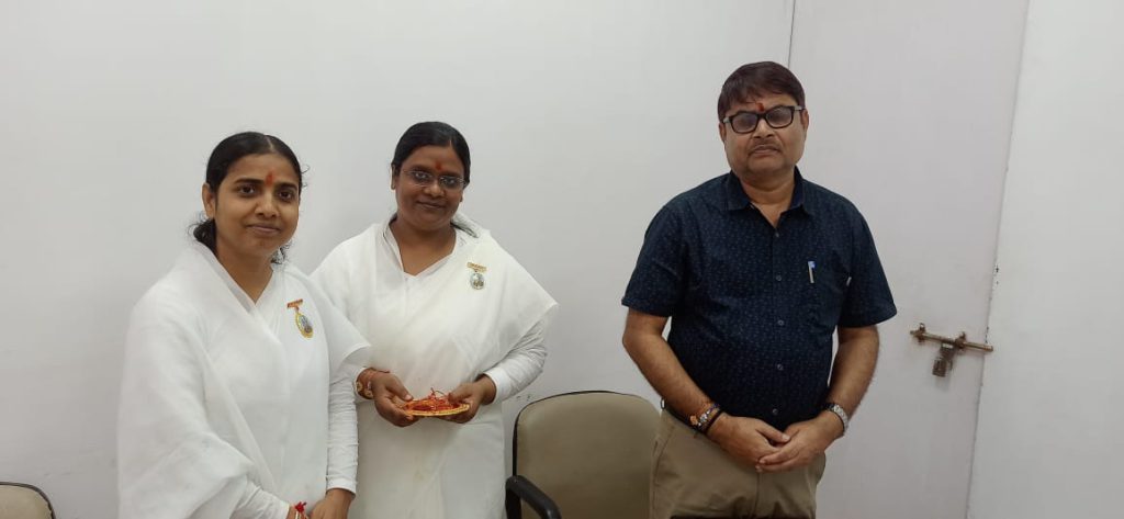 MIT इंजीनियरिंग कॉलेज के प्राचार्य भ्राता माता मिथिलेश झा जी को रक्षा सूत्र बांधती हुई राजयोगिनी बीके रानी दीदी जी