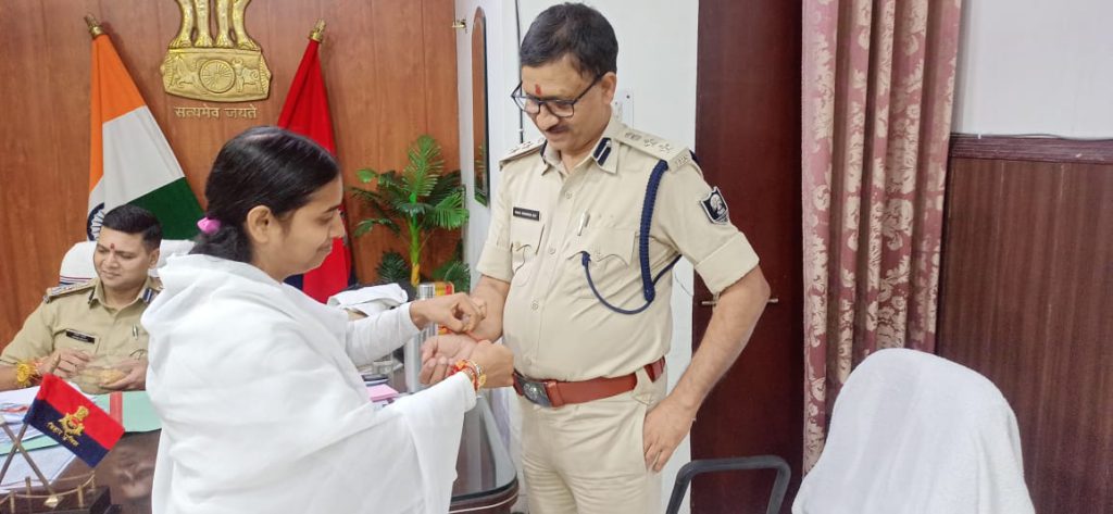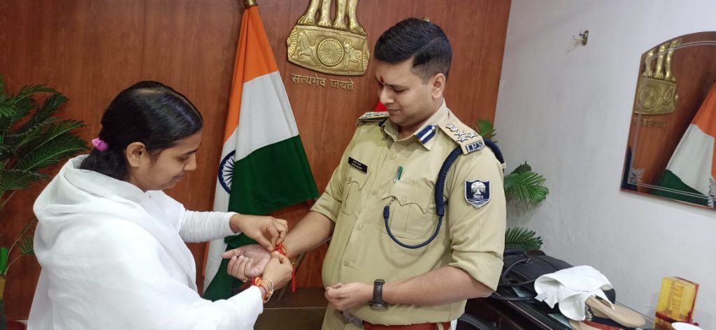 मुजफ्फरपुर के डी आई जी बि सैप IPS दैवी भ्राता आशीष भारती जी को रक्षा सूत्र बांधते हुए बीके सीता बहन एवं बीके बबीता बहन