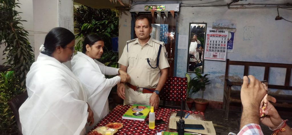 मुजफ्फरपुर काजी मोहम्मदपुर थाना के अध्यक्ष दैवी भ्राता जयप्रकाश सिंह जी राखी बांधते हुए बबीता बहन एवं सीता बहन
